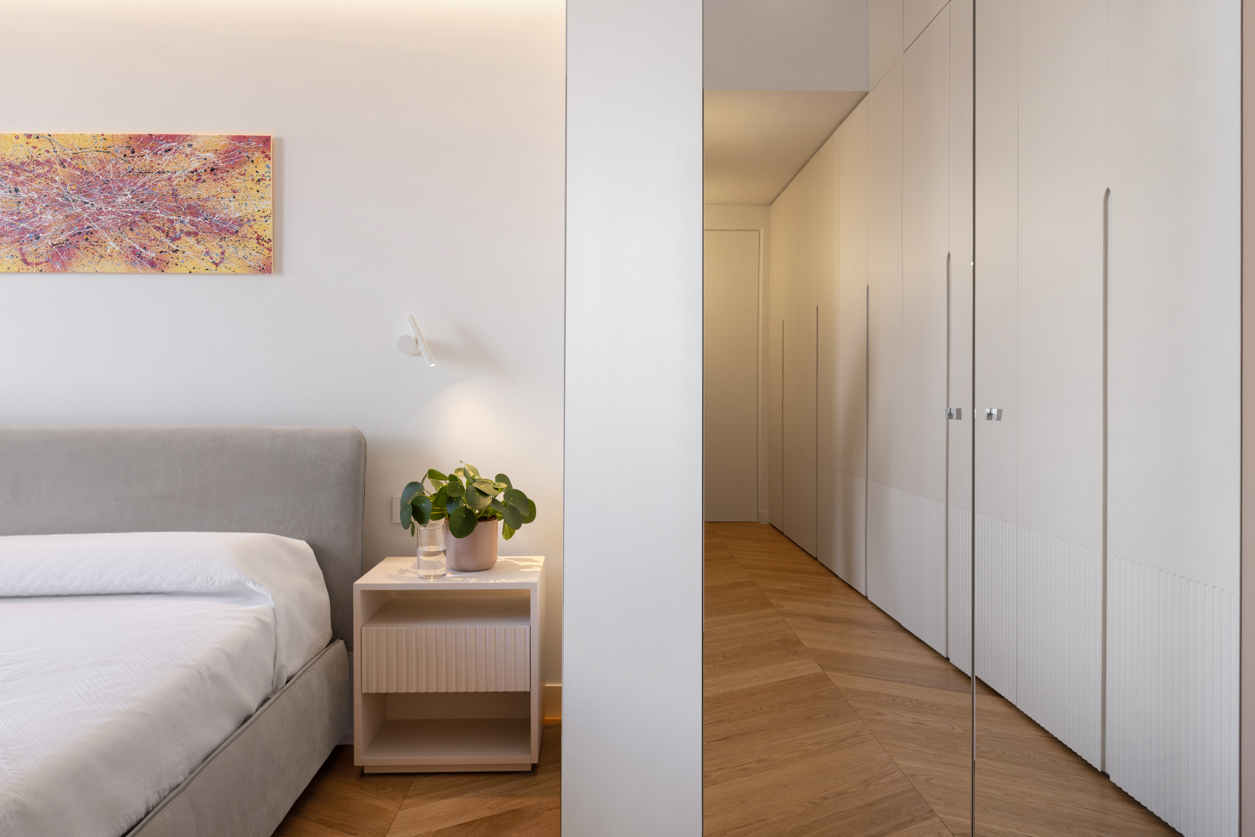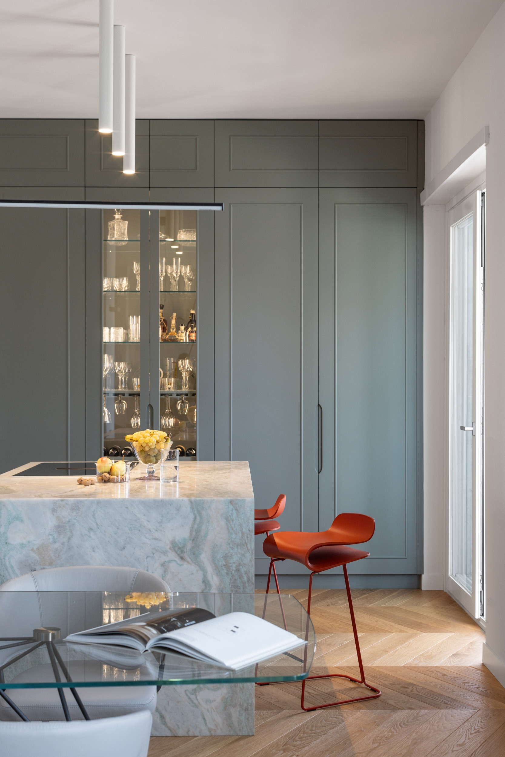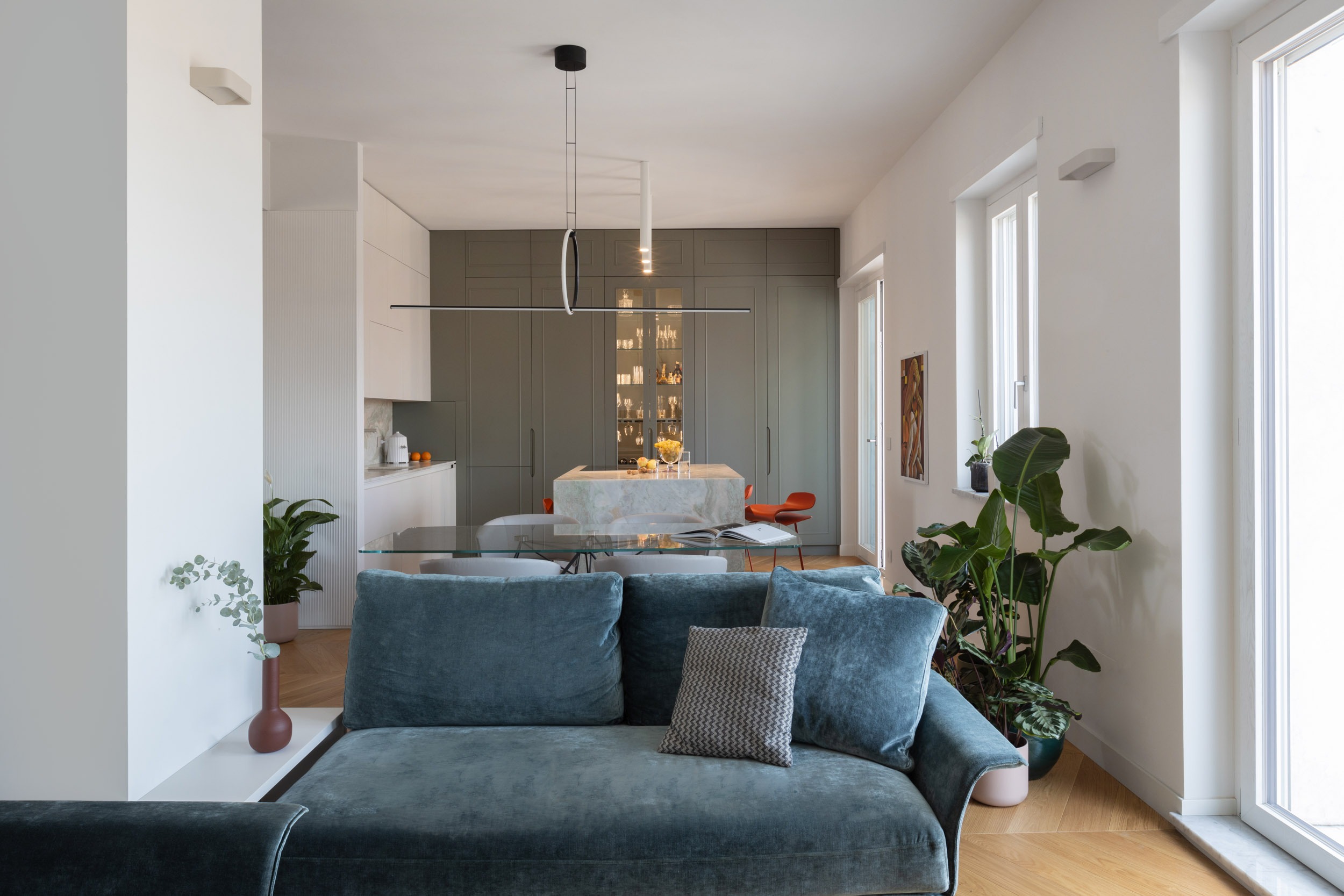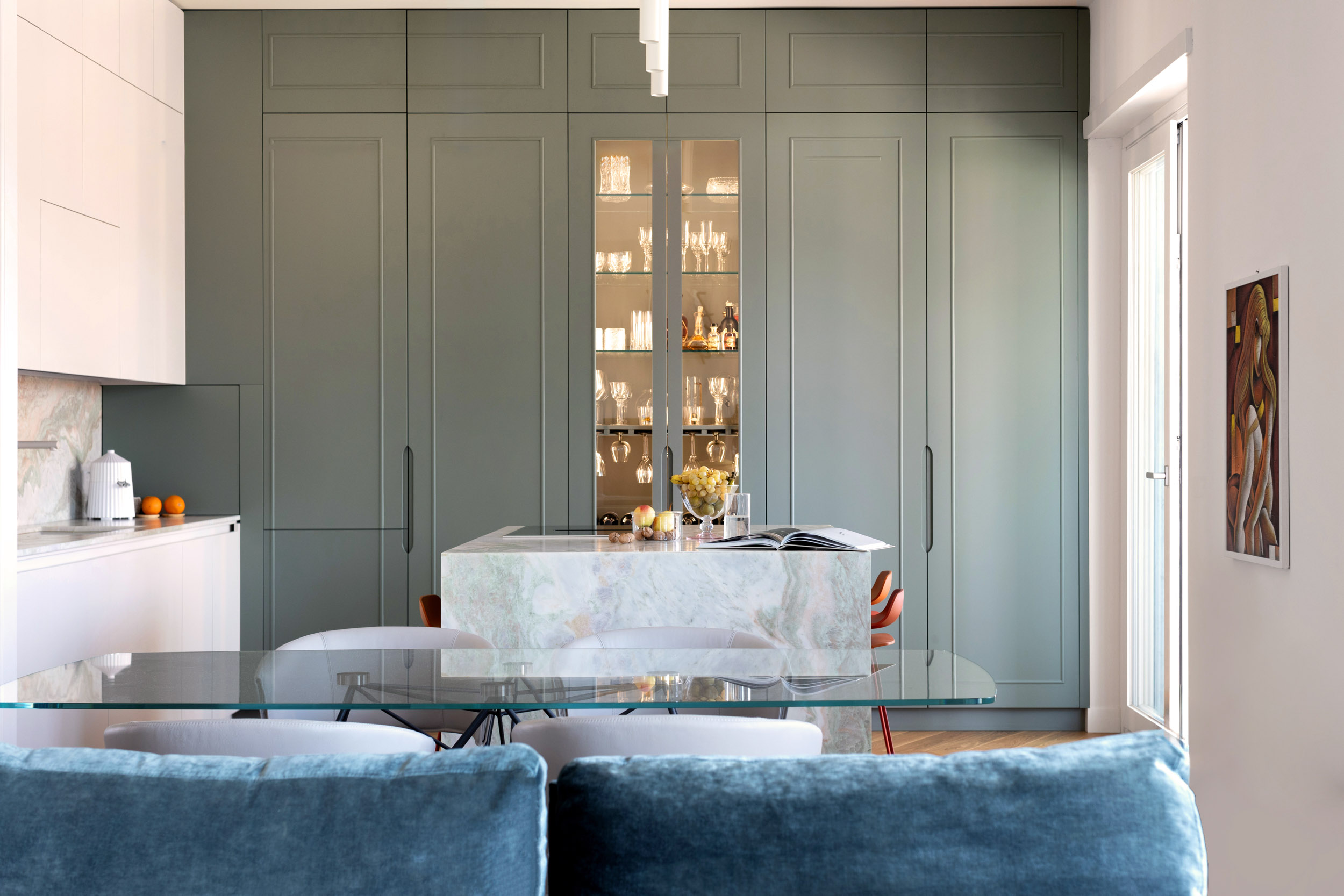 L’alloggio finemente ristrutturato si distingue per l’atmosfera raffinata dominata da colori tenui e delicati, in cui spiccano le colonne della cucina di un elegante verde ottanio chiaro. Queste con le loro modanature, reinterpretano in chiave moderna le boiserie d’epoca, smorzando la solidità della struttura grazie alle vetrine in vetro, che ne alleggeriscono l’impatto visivo. Il marmo Jakarta Pink, con le sue venature intense e tonalità delicate, arricchisce l’ambiente, conferendo un tocco di preziosità. Il living in stretta connessione con la cucina accoglie un divano Saba perfettamente coordinato con i toni della cucina. La camera da letto Padronale è un piccolo gioiello, con due aperture specchiate e vetrate che si intersecano con il bagno, dove una vasca freestanding rappresenta il fulcro di uno spazio pensato per il relax e il benessere.