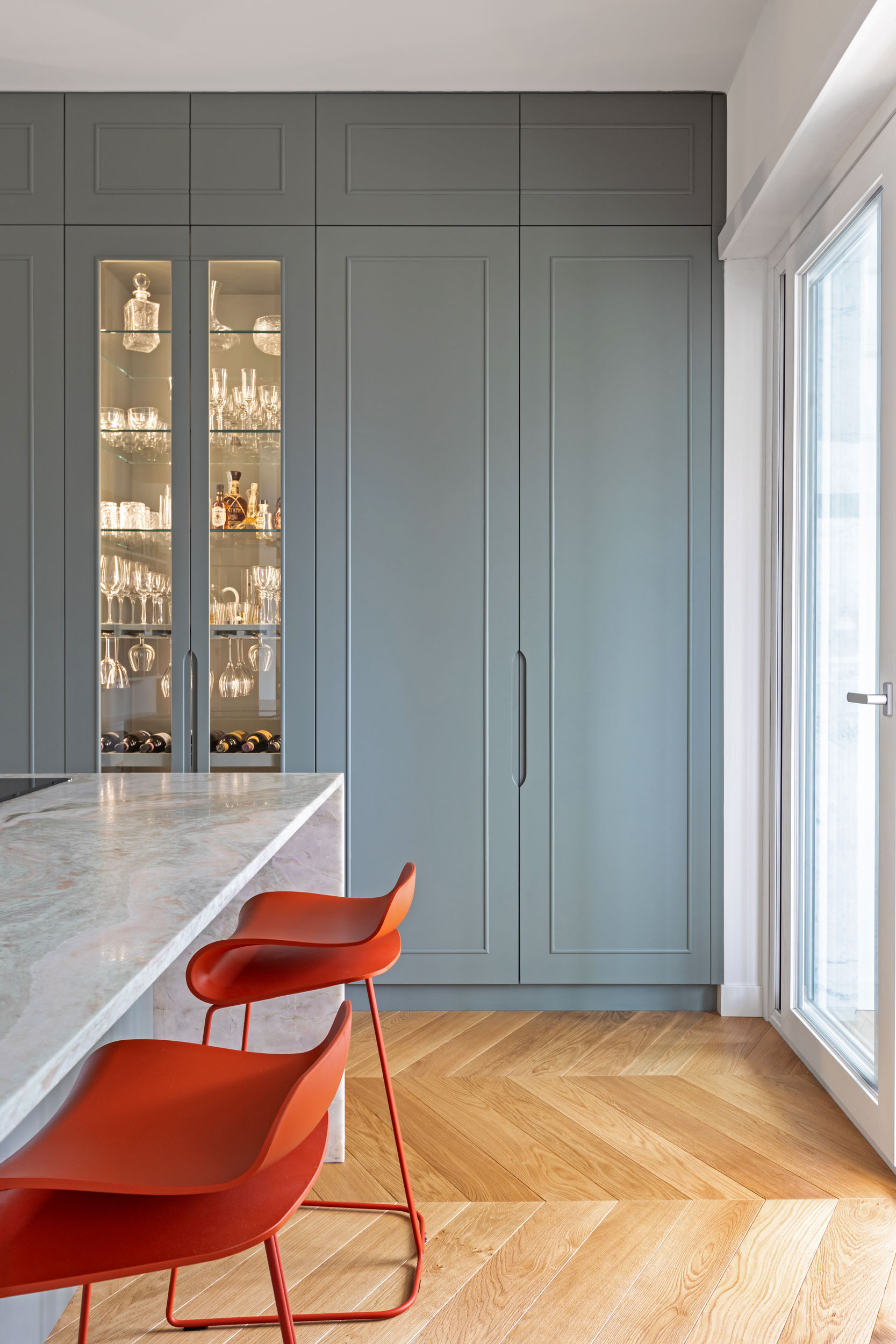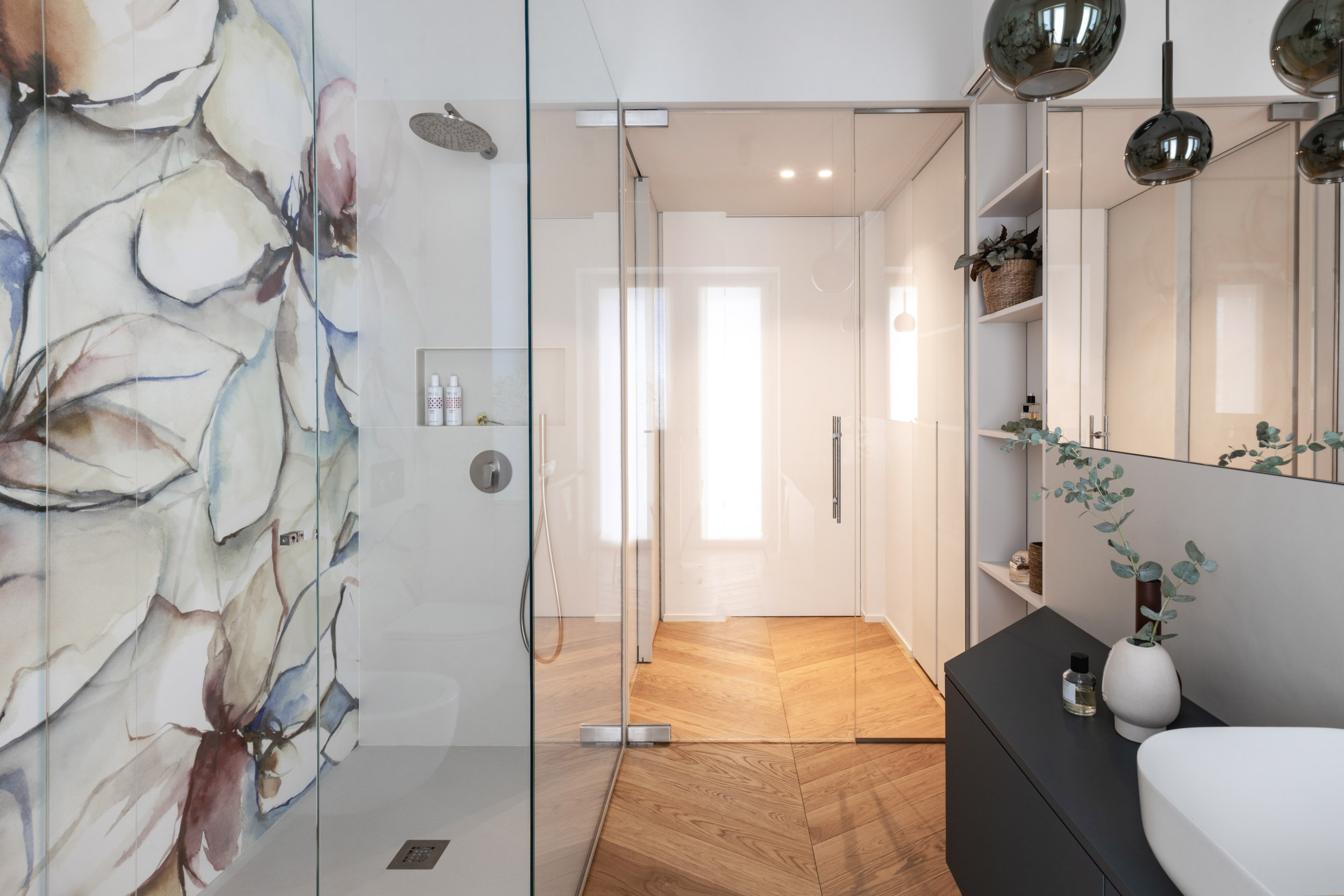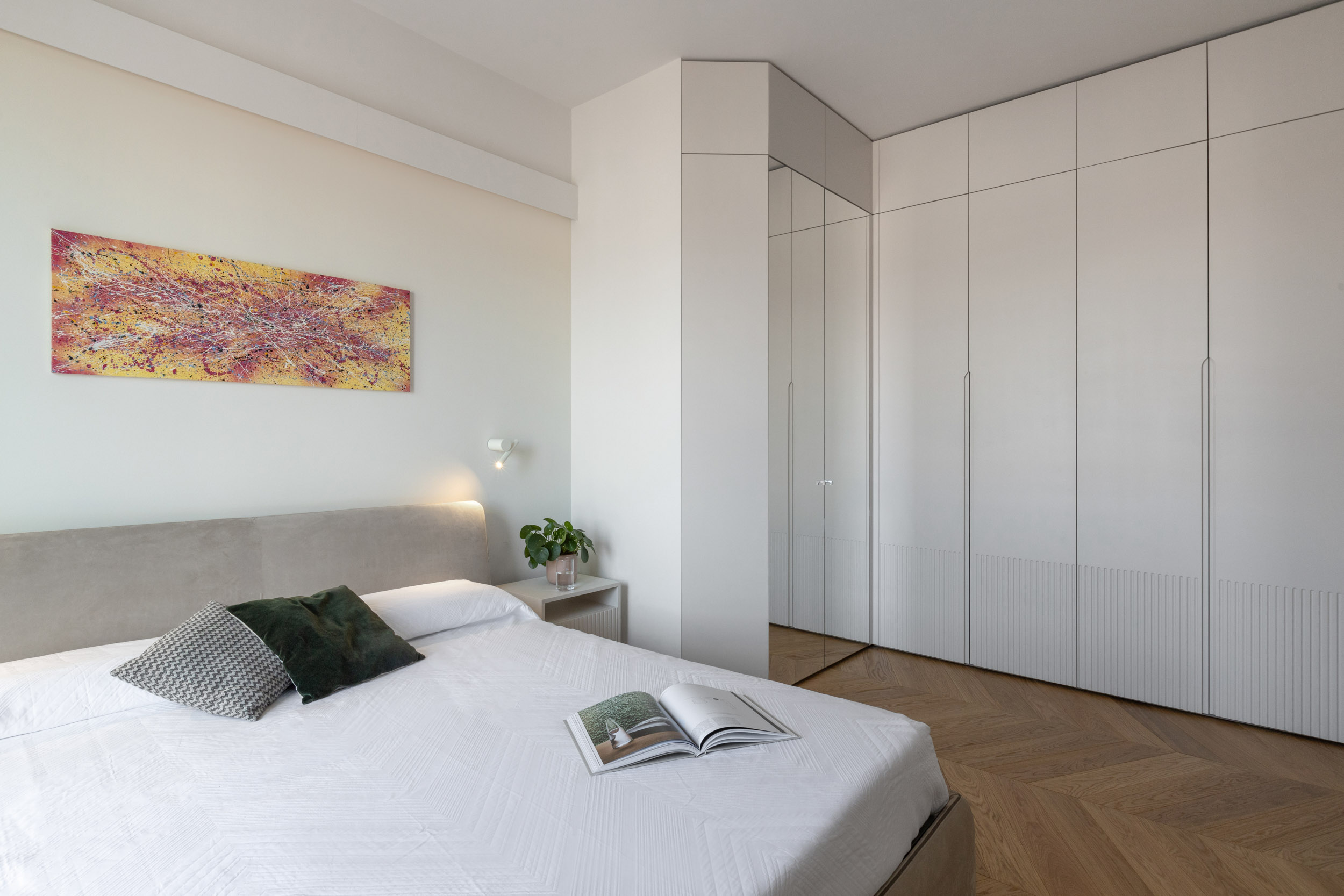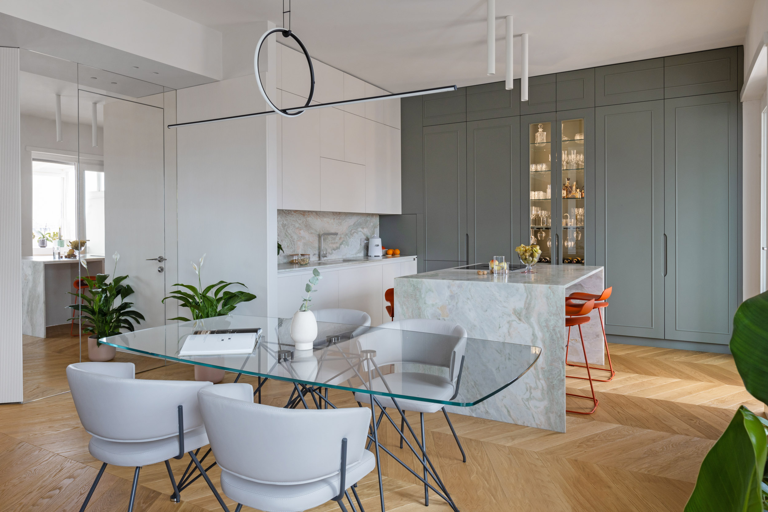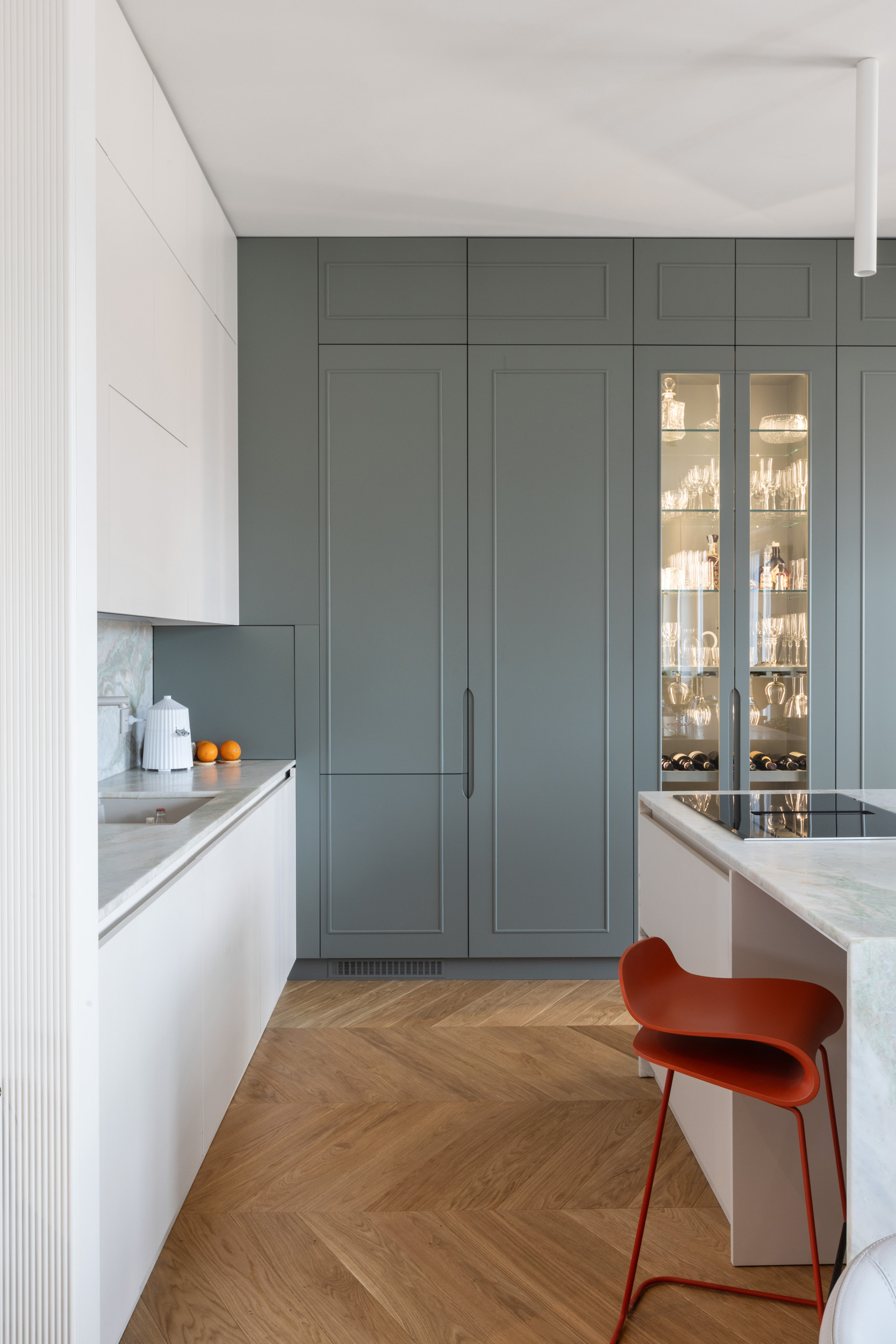 L’alloggio finemente ristrutturato si distingue per l’atmosfera raffinata dominata da colori tenui e delicati, in cui spiccano le colonne della cucina di un elegante verde ottanio chiaro. Queste con le loro modanature, reinterpretano in chiave moderna le boiserie d’epoca, smorzando la solidità della struttura grazie alle vetrine in vetro, che ne alleggeriscono l’impatto visivo. Il marmo Jakarta Pink, con le sue venature intense e tonalità delicate, arricchisce l’ambiente, conferendo un tocco di preziosità. Il living in stretta connessione con la cucina accoglie un divano Saba perfettamente coordinato con i toni della cucina. La camera da letto Padronale è un piccolo gioiello, con due aperture specchiate e vetrate che si intersecano con il bagno, dove una vasca freestanding rappresenta il fulcro di uno spazio pensato per il relax e il benessere.