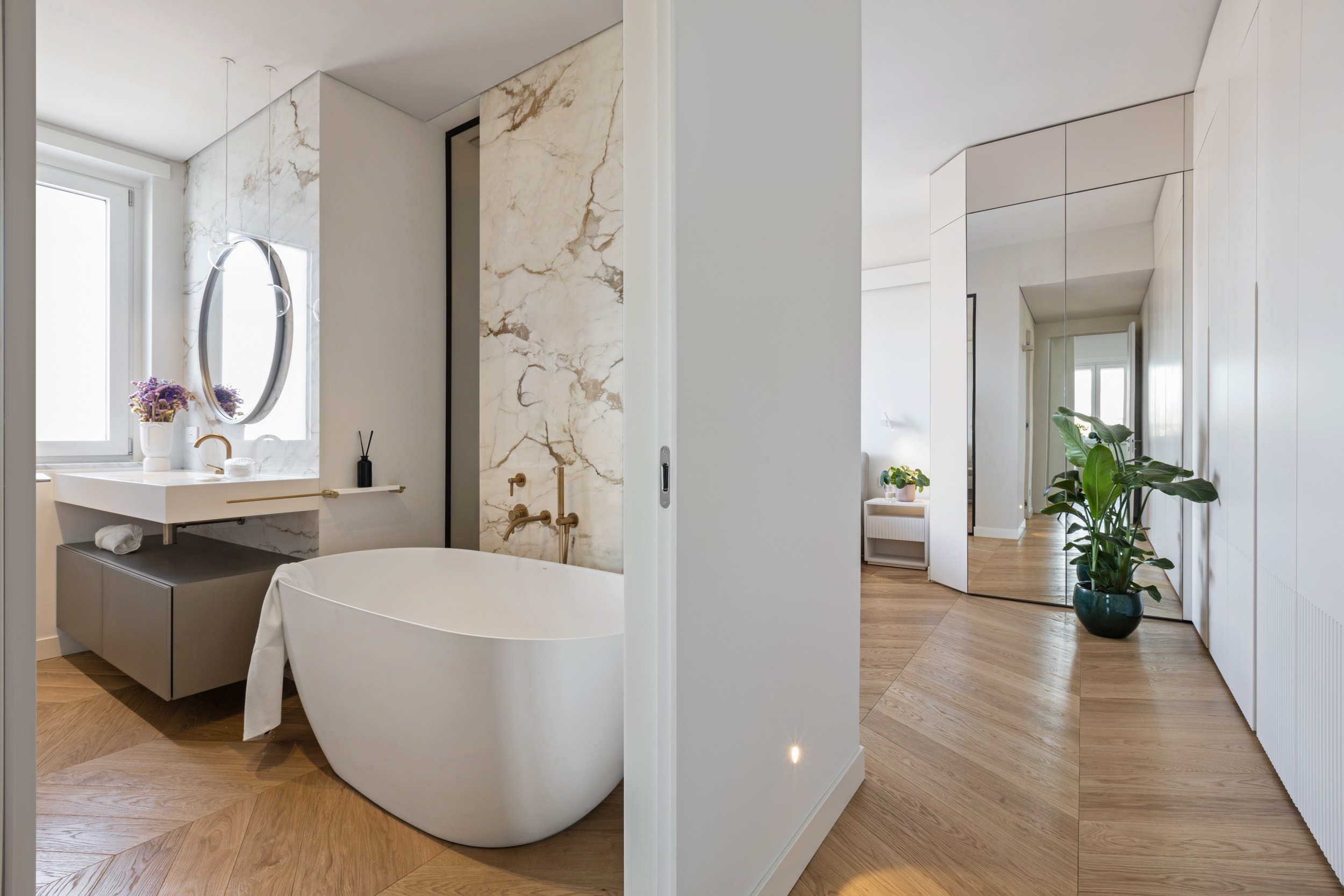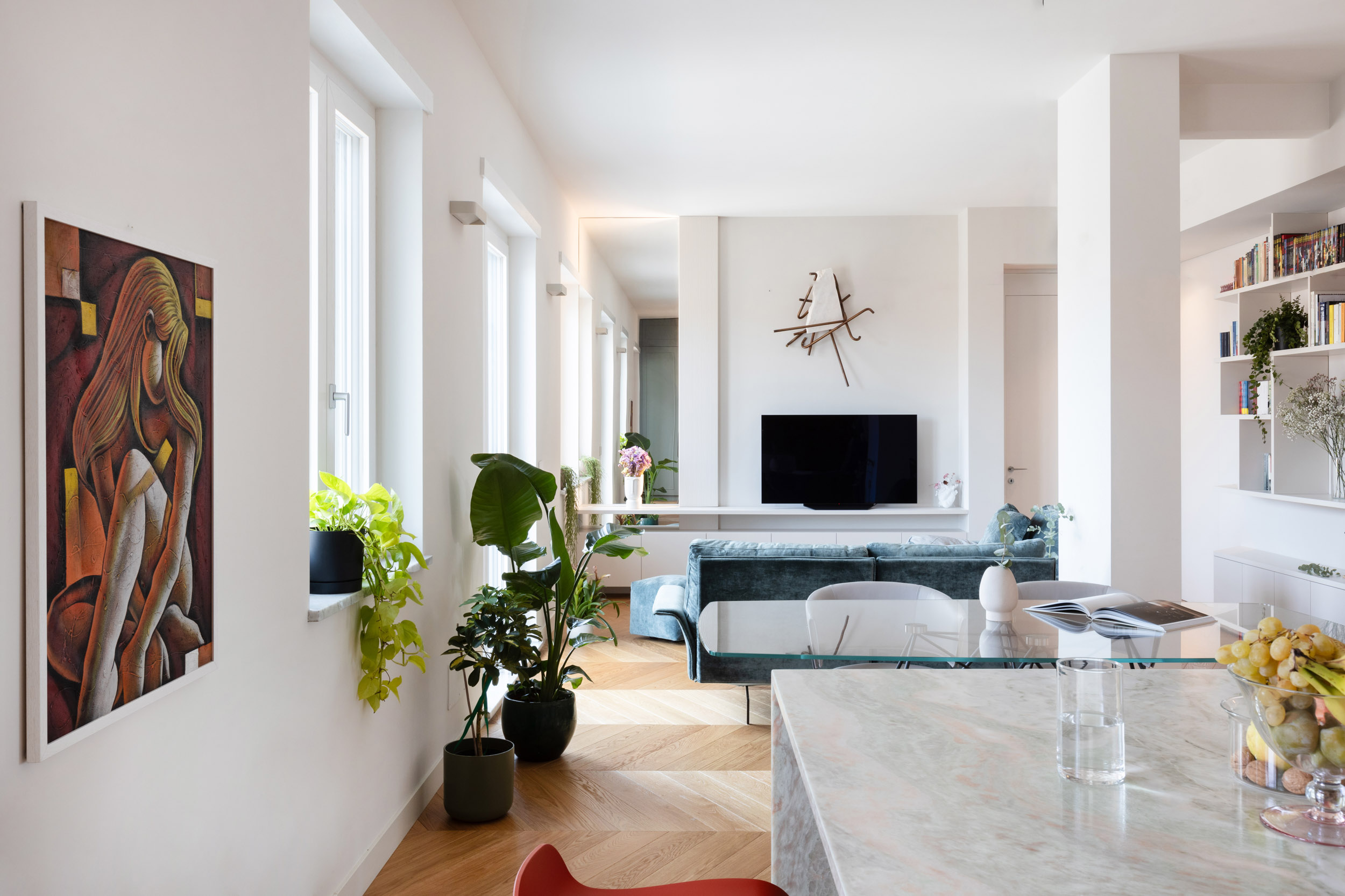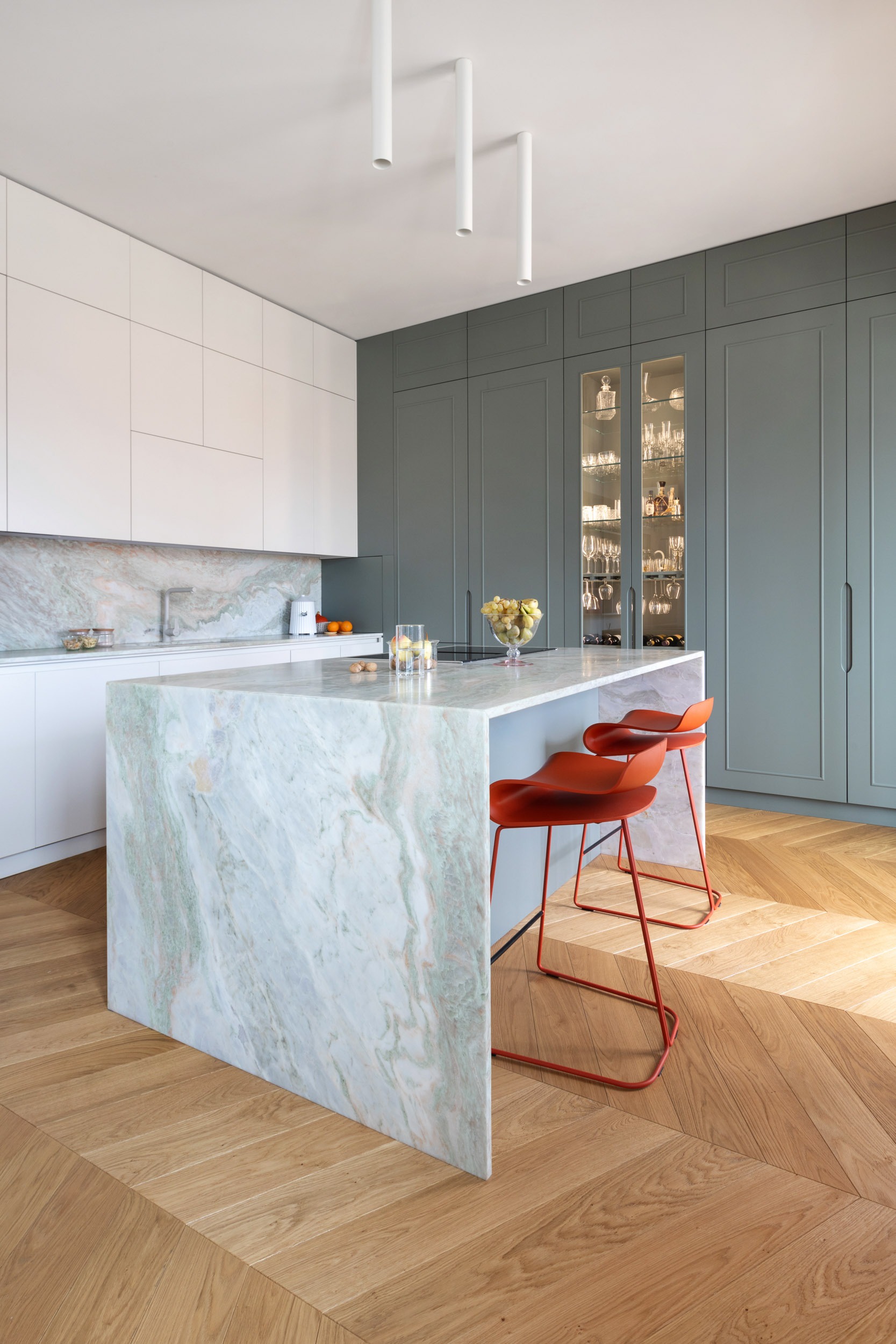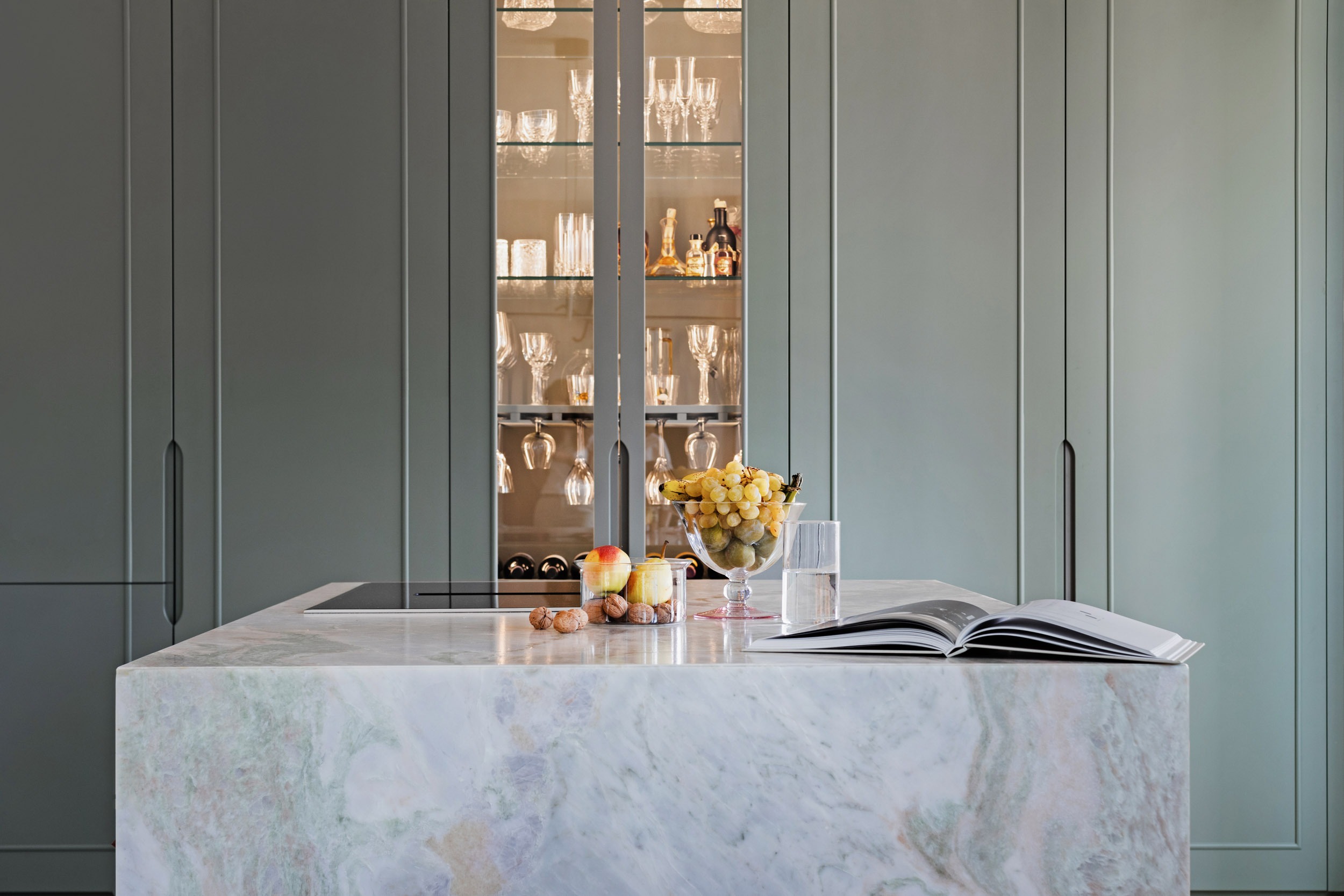 L’alloggio finemente ristrutturato si distingue per l’atmosfera raffinata dominata da colori tenui e delicati, in cui spiccano le colonne della cucina di un elegante verde ottanio chiaro. Queste con le loro modanature, reinterpretano in chiave moderna le boiserie d’epoca, smorzando la solidità della struttura grazie alle vetrine in vetro, che ne alleggeriscono l’impatto visivo. Il marmo Jakarta Pink, con le sue venature intense e tonalità delicate, arricchisce l’ambiente, conferendo un tocco di preziosità. Il living in stretta connessione con la cucina accoglie un divano Saba perfettamente coordinato con i toni della cucina. La camera da letto Padronale è un piccolo gioiello, con due aperture specchiate e vetrate che si intersecano con il bagno, dove una vasca freestanding rappresenta il fulcro di uno spazio pensato per il relax e il benessere.