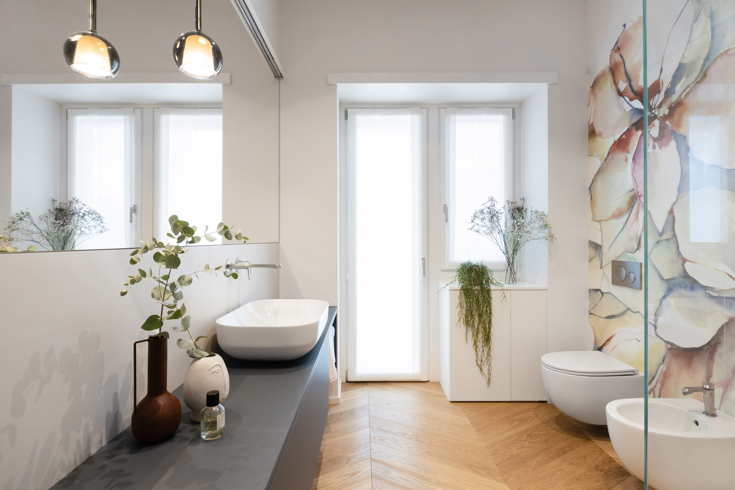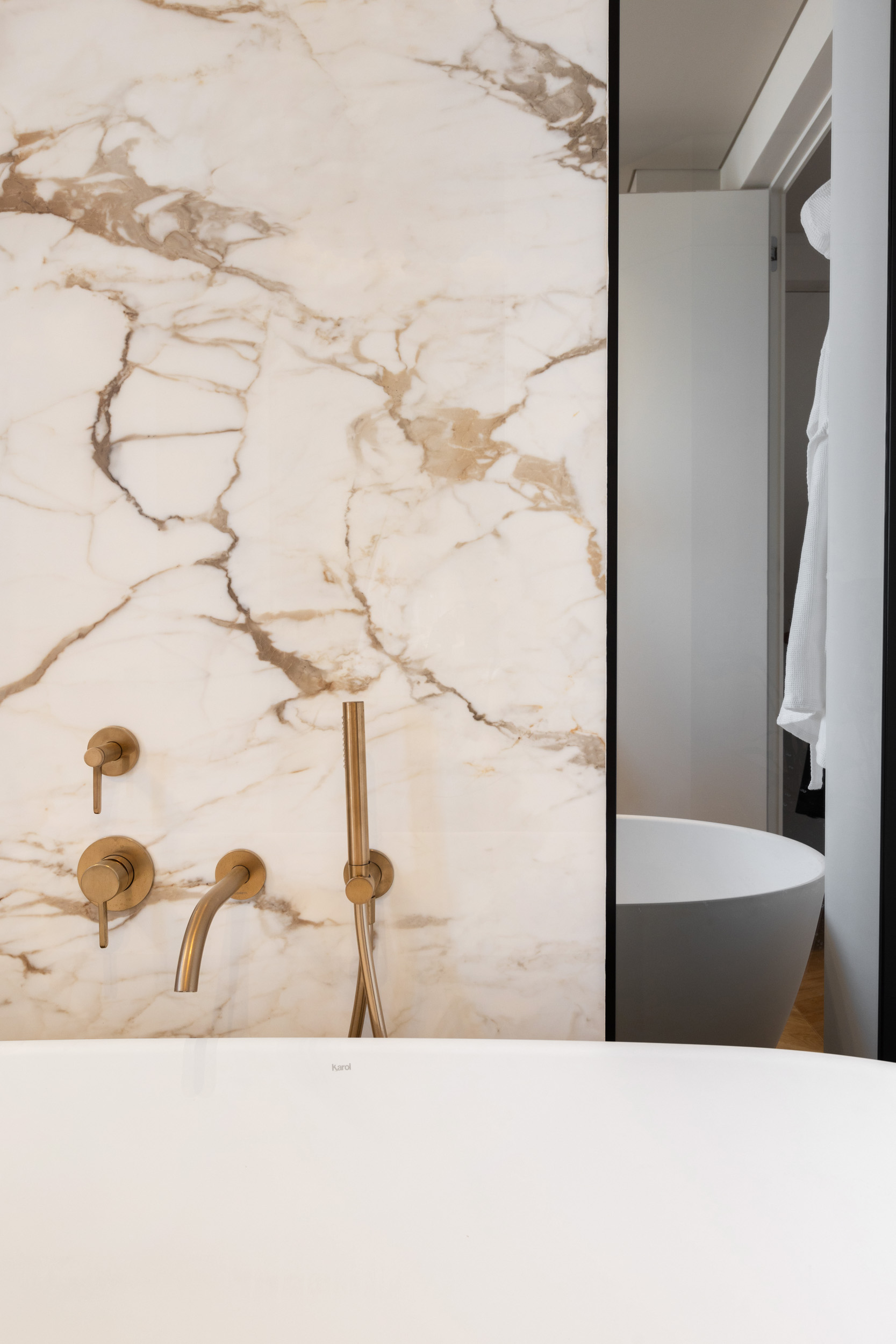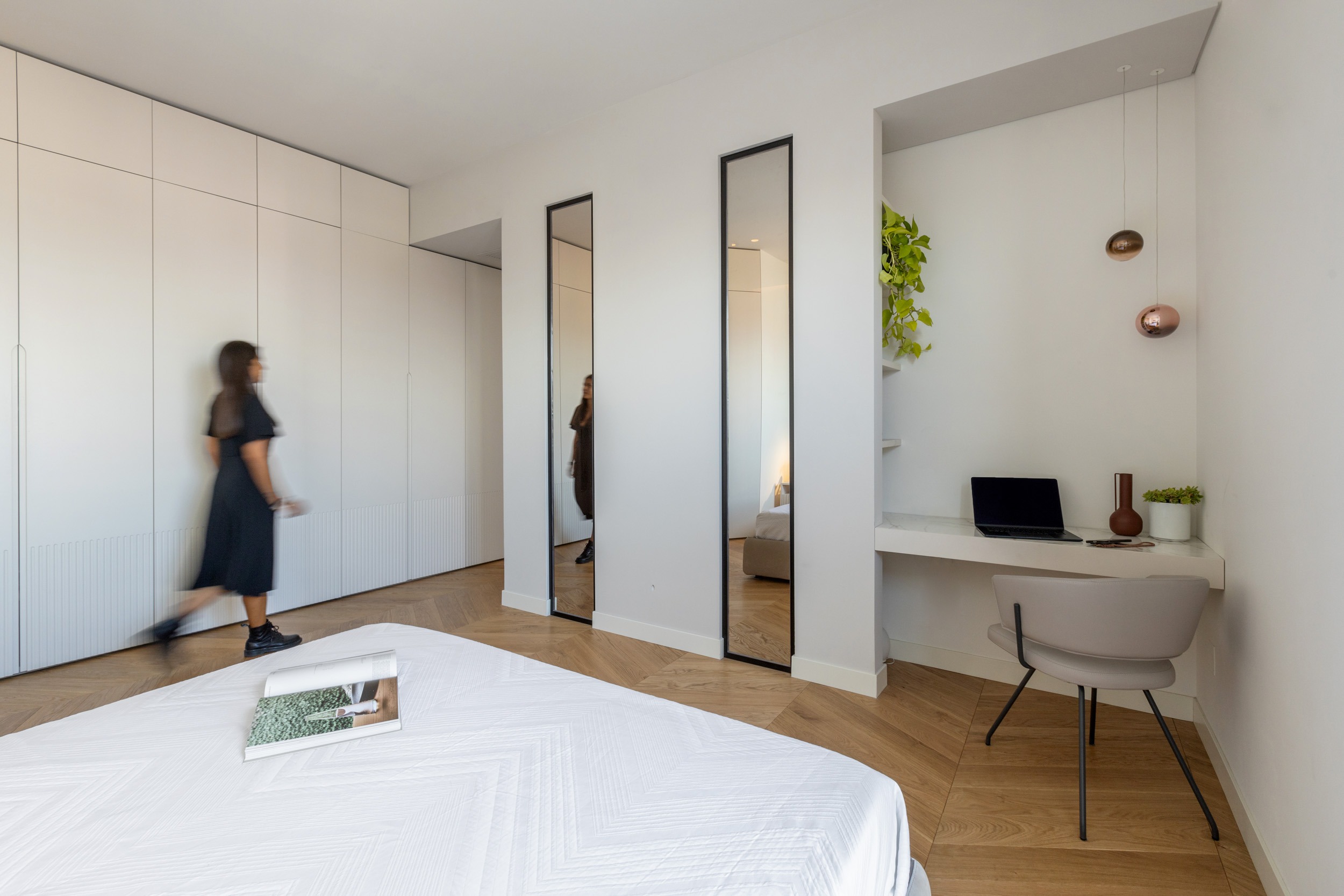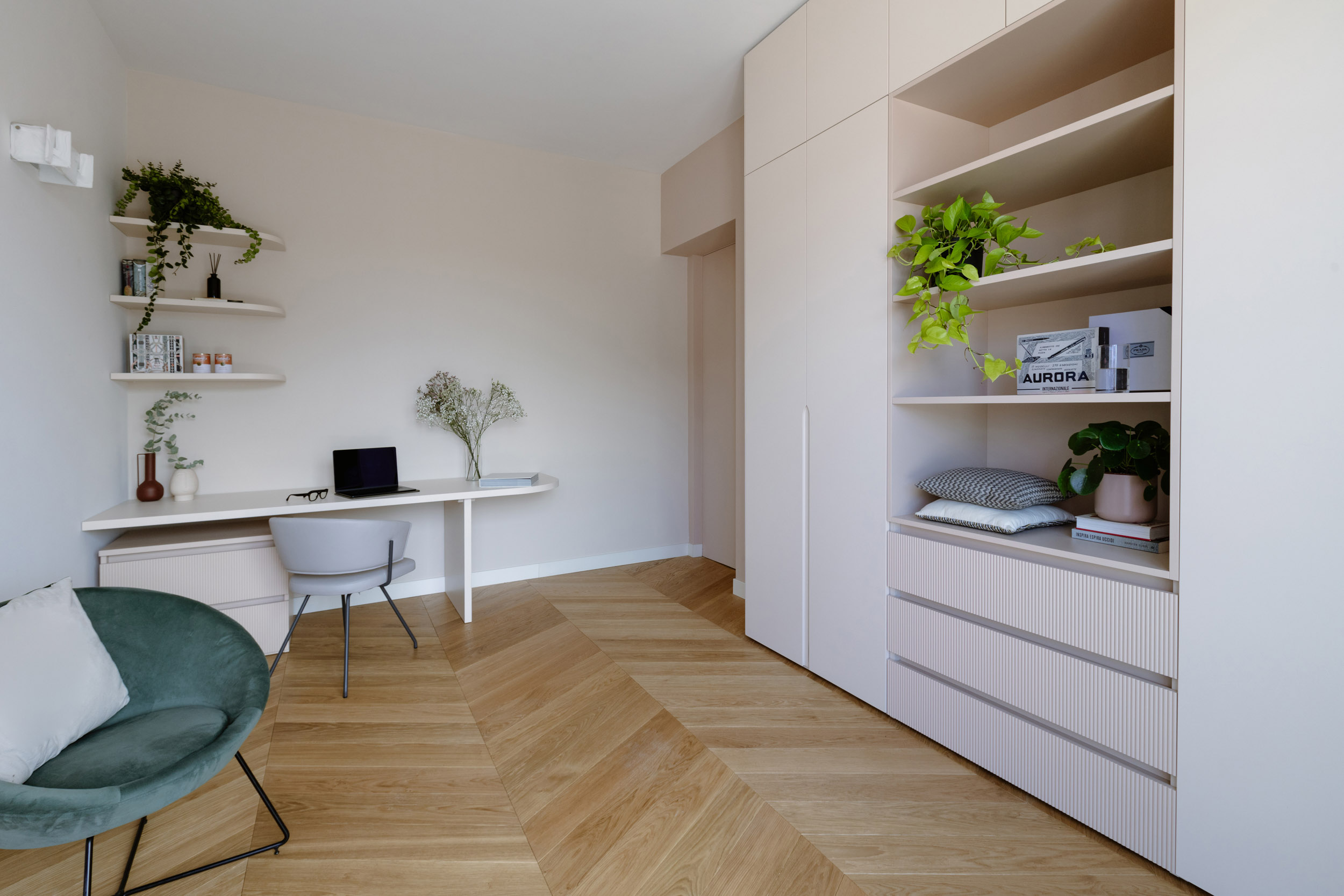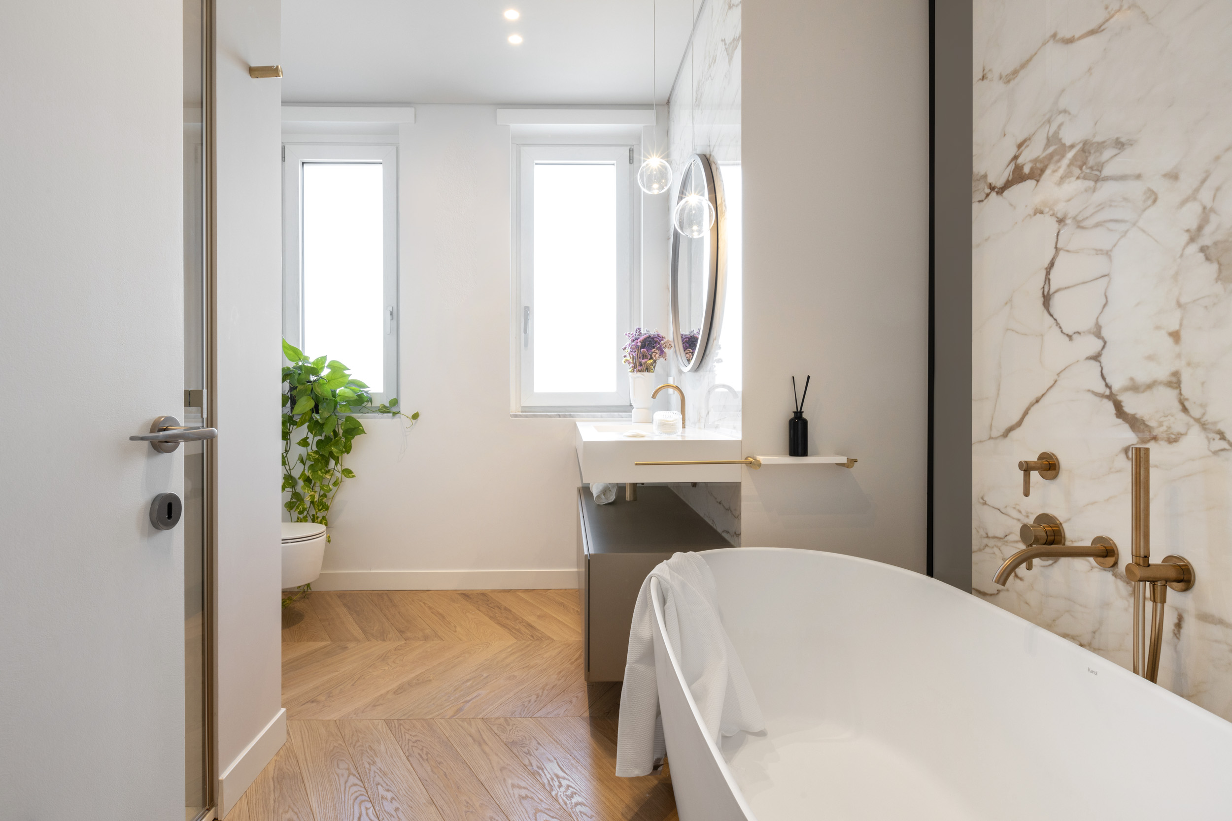 L’alloggio finemente ristrutturato si distingue per l’atmosfera raffinata dominata da colori tenui e delicati, in cui spiccano le colonne della cucina di un elegante verde ottanio chiaro. Queste con le loro modanature, reinterpretano in chiave moderna le boiserie d’epoca, smorzando la solidità della struttura grazie alle vetrine in vetro, che ne alleggeriscono l’impatto visivo. Il marmo Jakarta Pink, con le sue venature intense e tonalità delicate, arricchisce l’ambiente, conferendo un tocco di preziosità. Il living in stretta connessione con la cucina accoglie un divano Saba perfettamente coordinato con i toni della cucina. La camera da letto Padronale è un piccolo gioiello, con due aperture specchiate e vetrate che si intersecano con il bagno, dove una vasca freestanding rappresenta il fulcro di uno spazio pensato per il relax e il benessere.