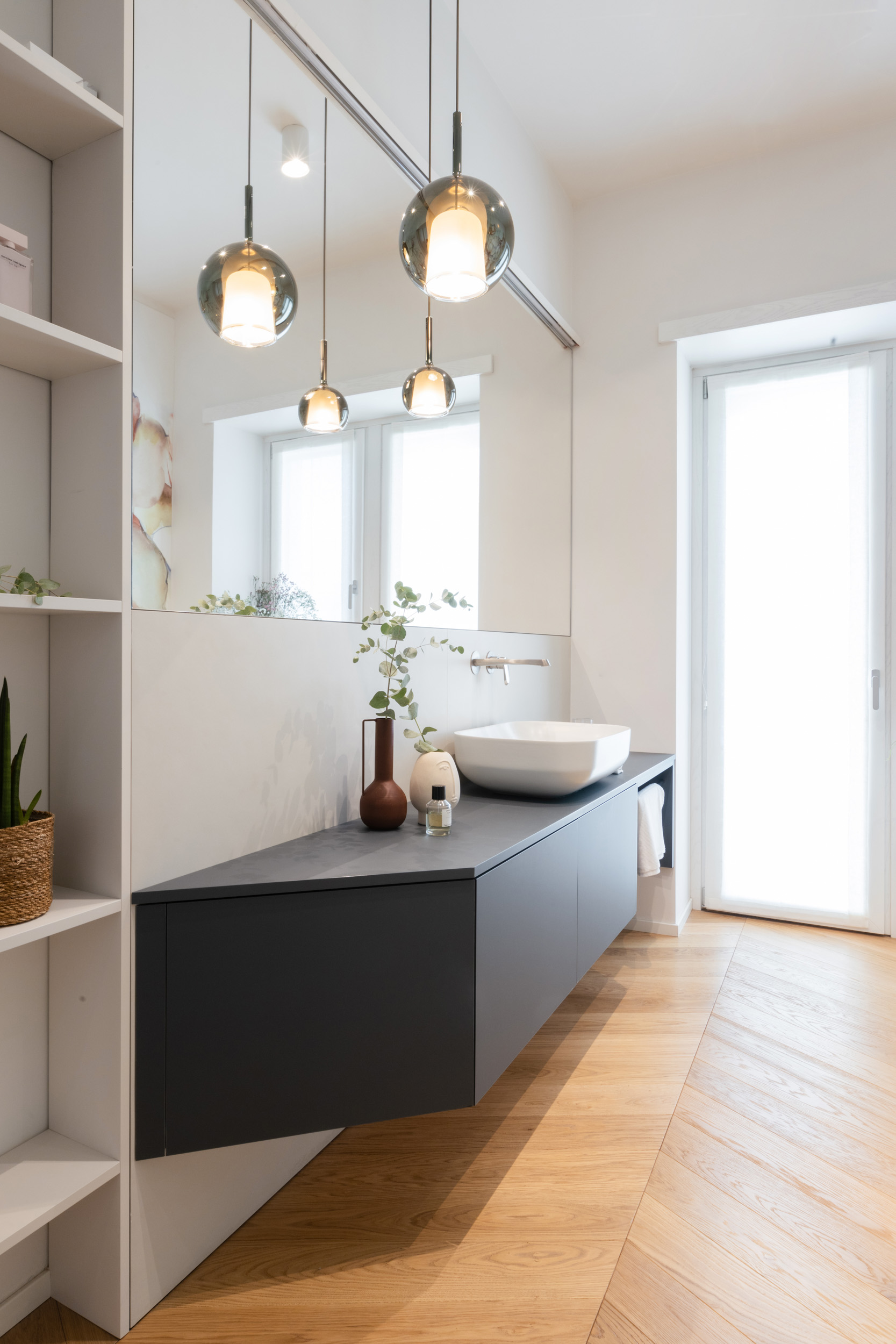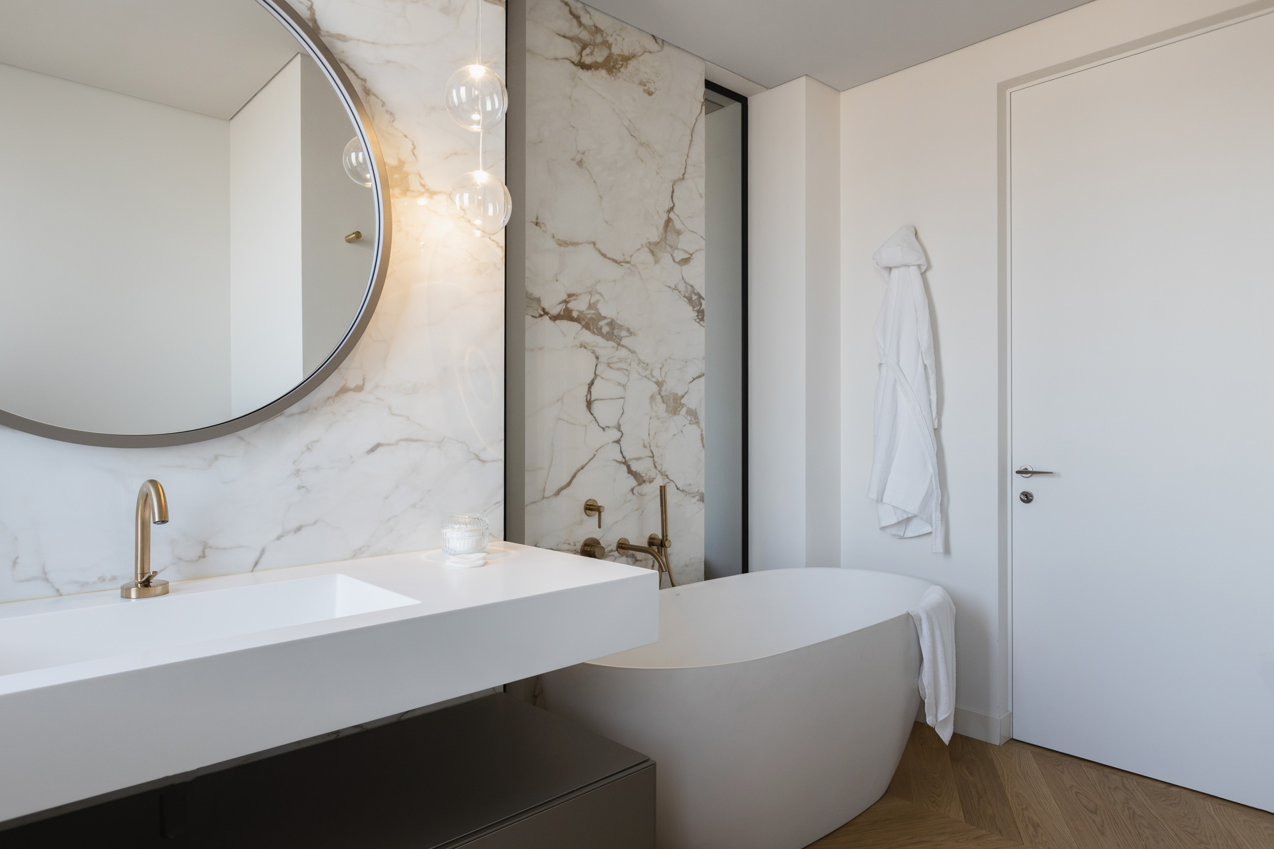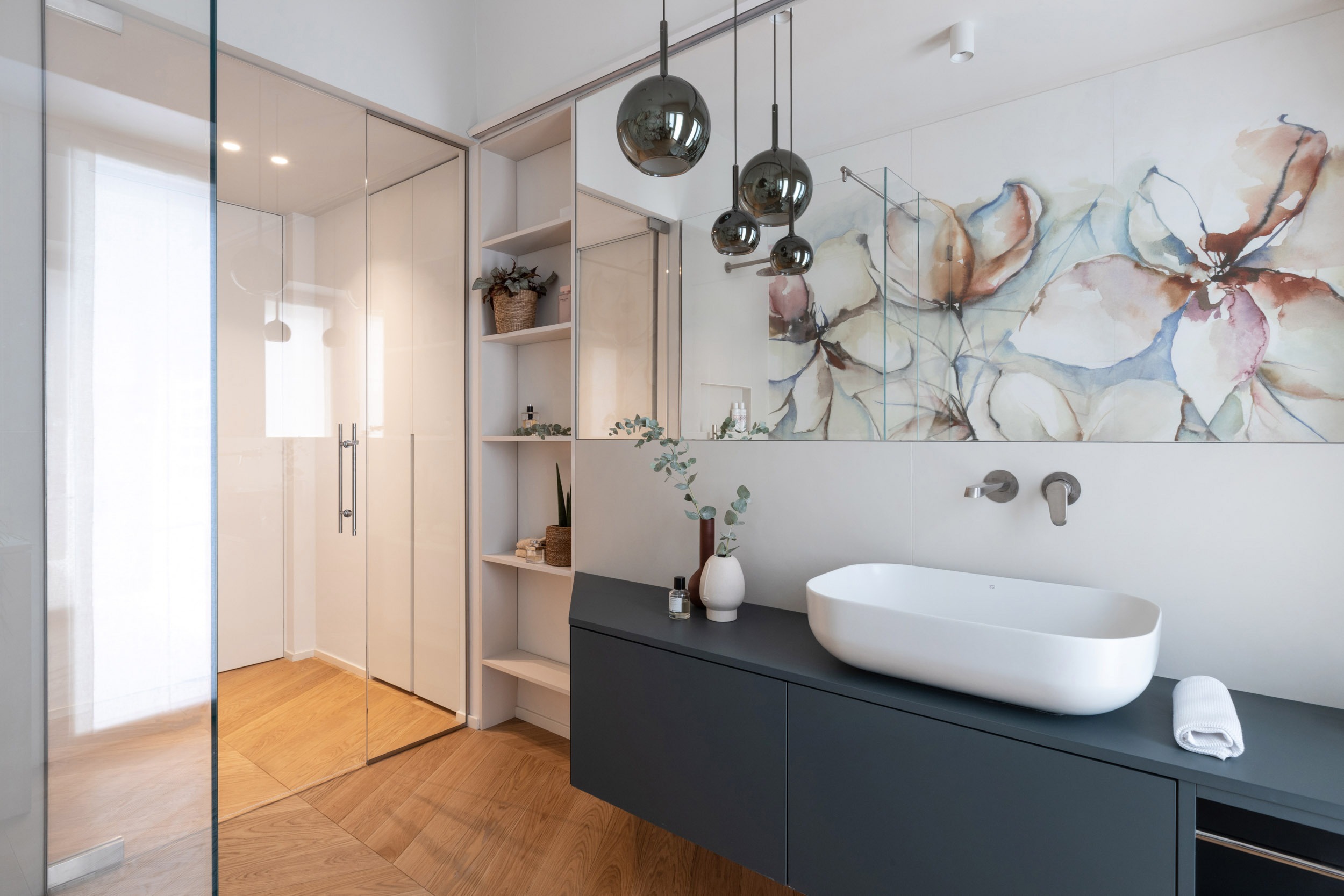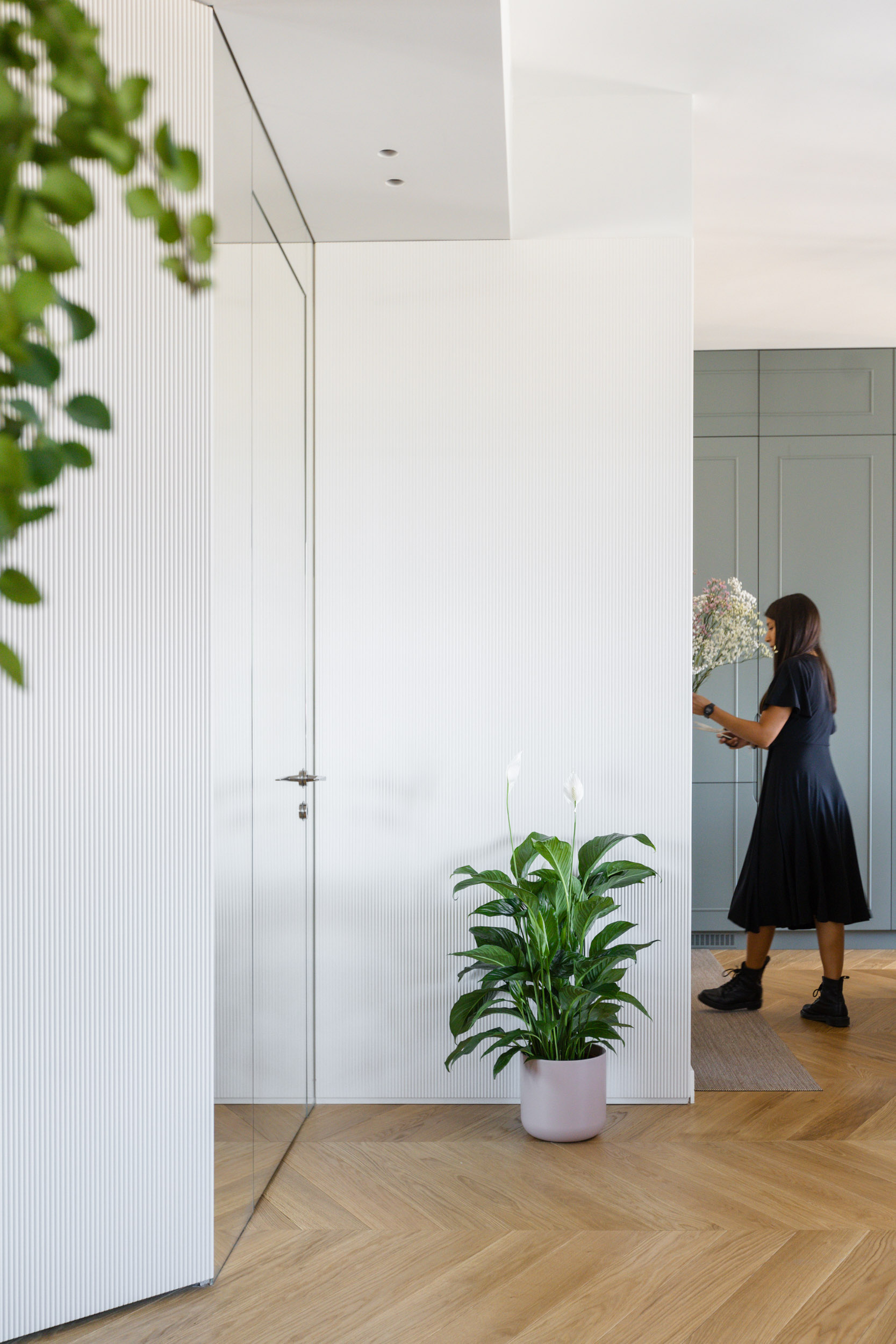 L’alloggio finemente ristrutturato si distingue per l’atmosfera raffinata dominata da colori tenui e delicati, in cui spiccano le colonne della cucina di un elegante verde ottanio chiaro. Queste con le loro modanature, reinterpretano in chiave moderna le boiserie d’epoca, smorzando la solidità della struttura grazie alle vetrine in vetro, che ne alleggeriscono l’impatto visivo. Il marmo Jakarta Pink, con le sue venature intense e tonalità delicate, arricchisce l’ambiente, conferendo un tocco di preziosità. Il living in stretta connessione con la cucina accoglie un divano Saba perfettamente coordinato con i toni della cucina. La camera da letto Padronale è un piccolo gioiello, con due aperture specchiate e vetrate che si intersecano con il bagno, dove una vasca freestanding rappresenta il fulcro di uno spazio pensato per il relax e il benessere.