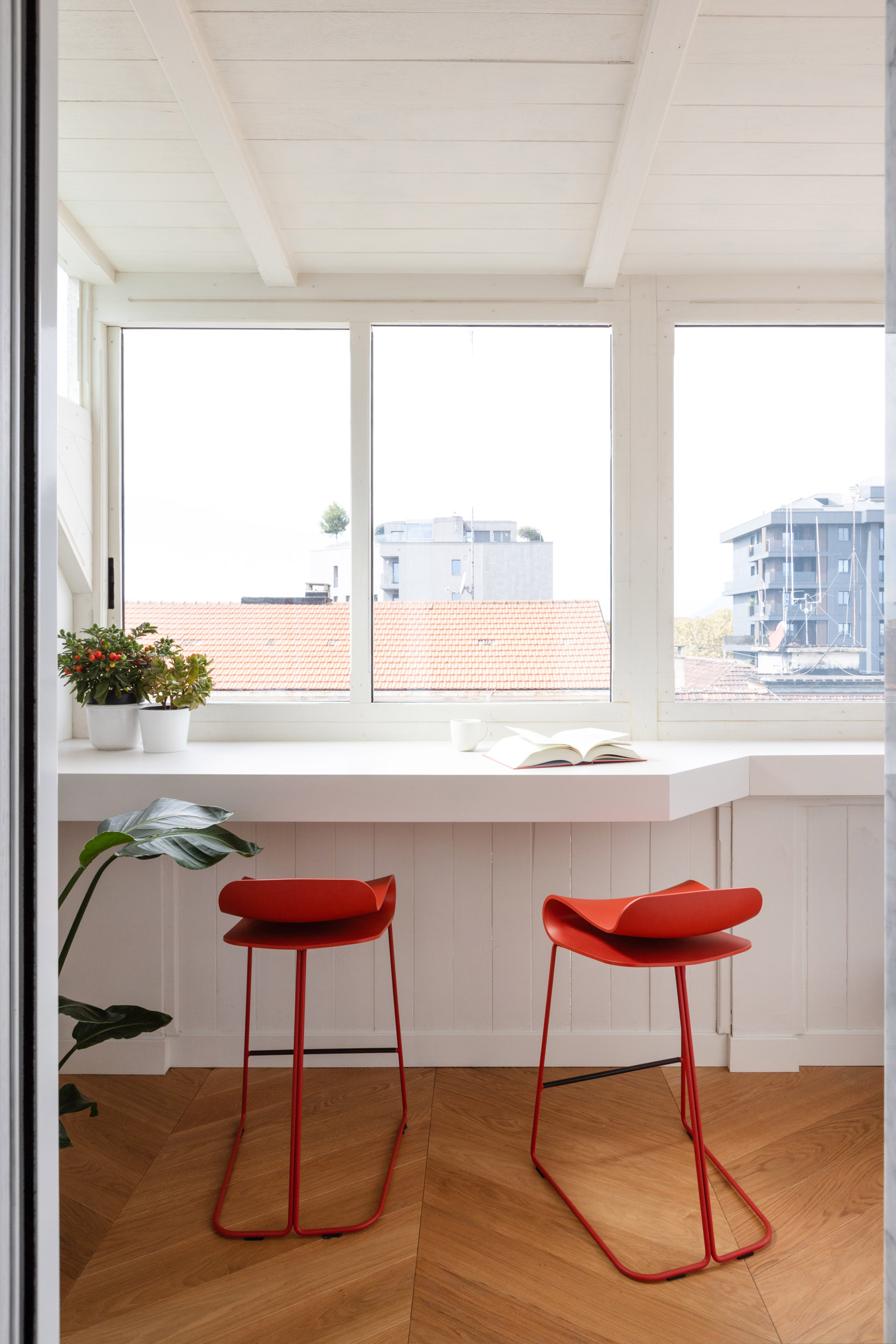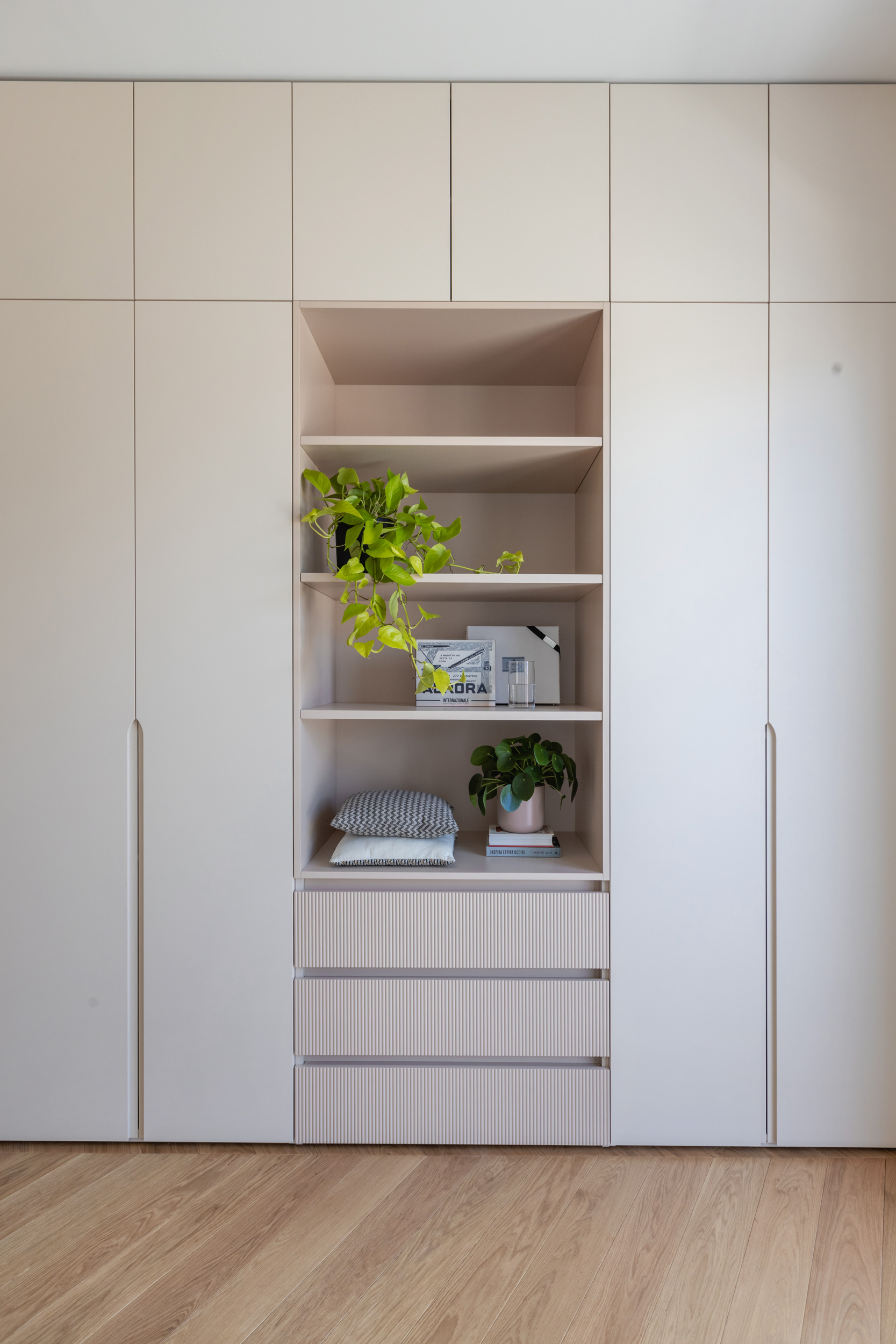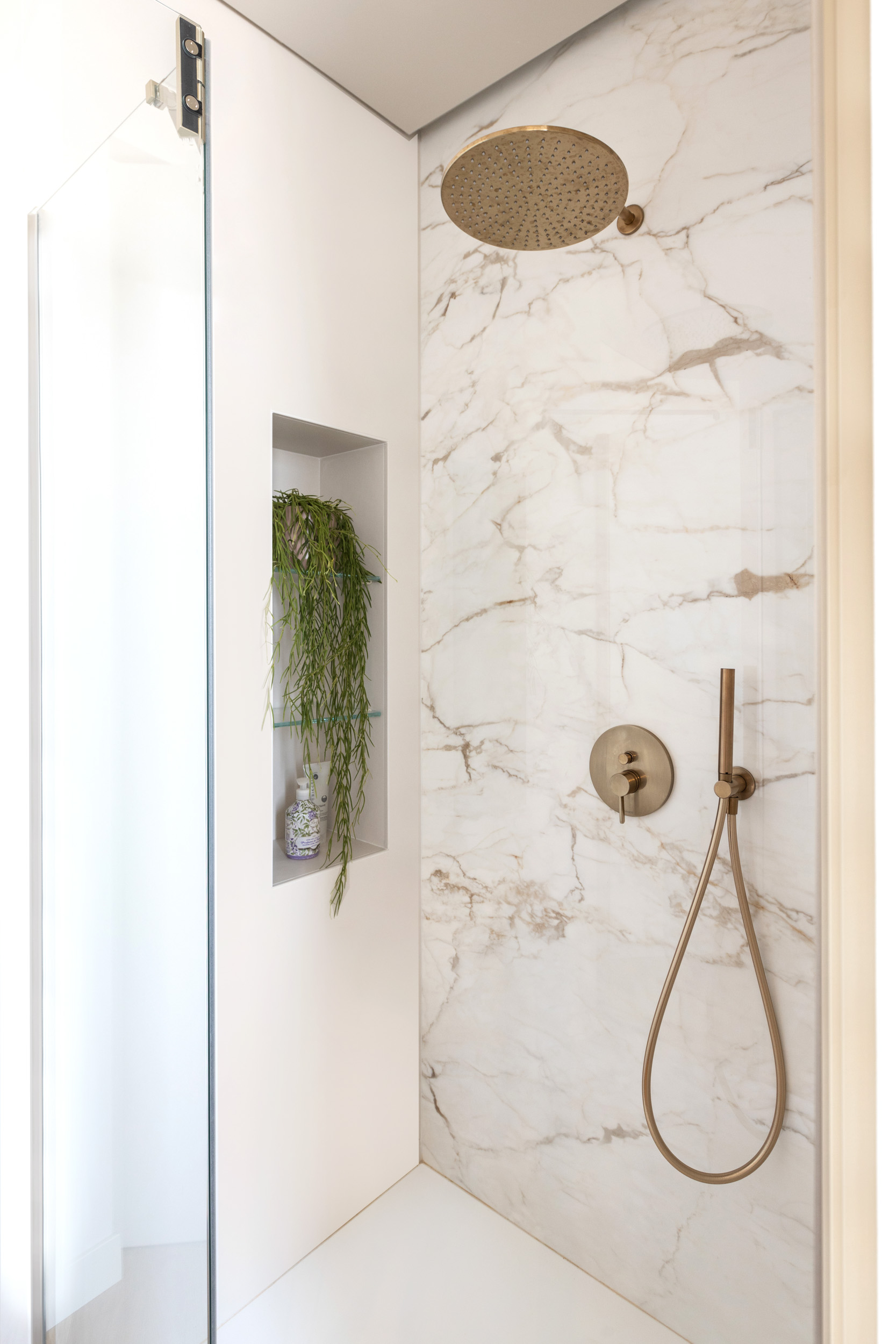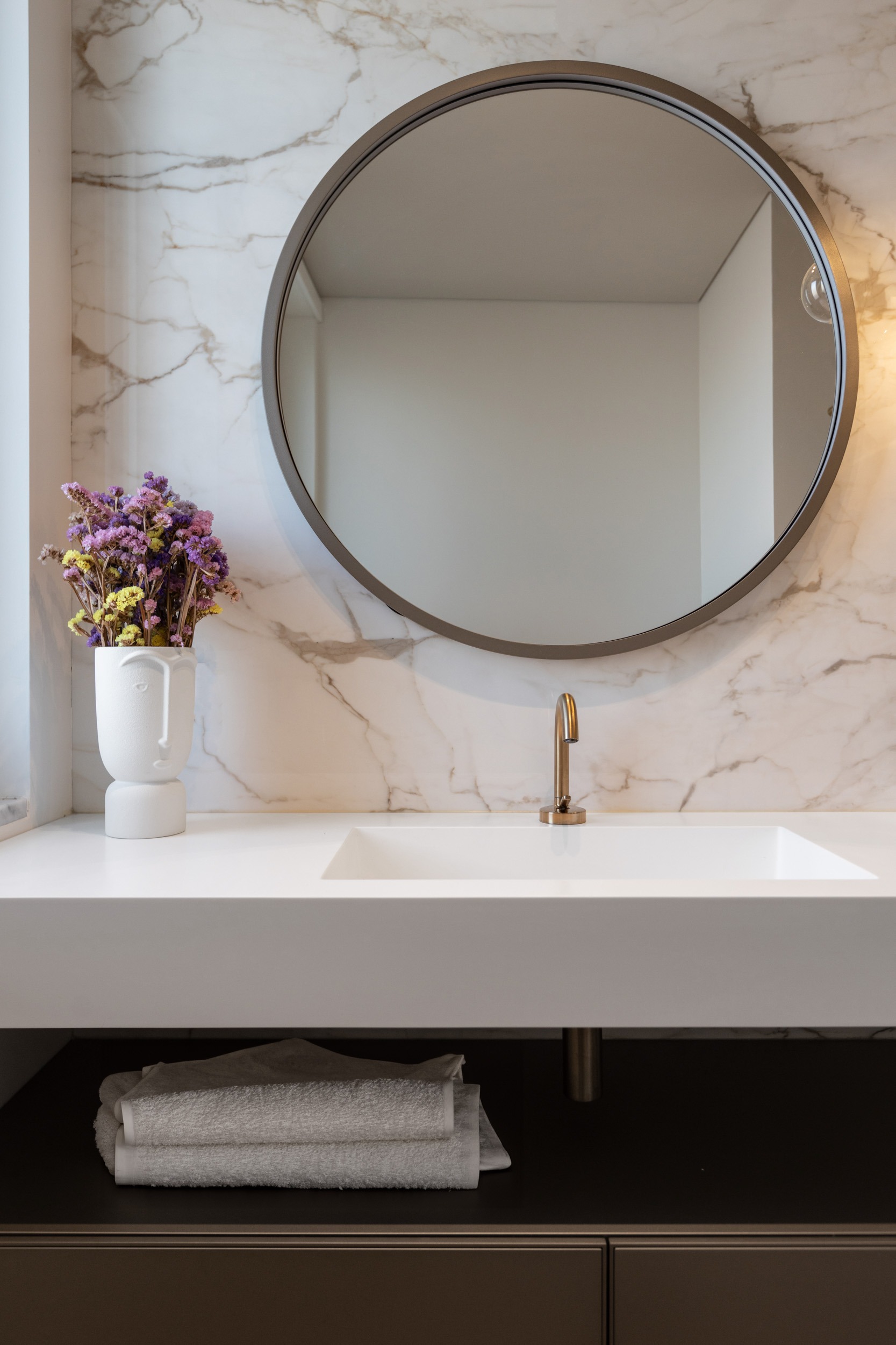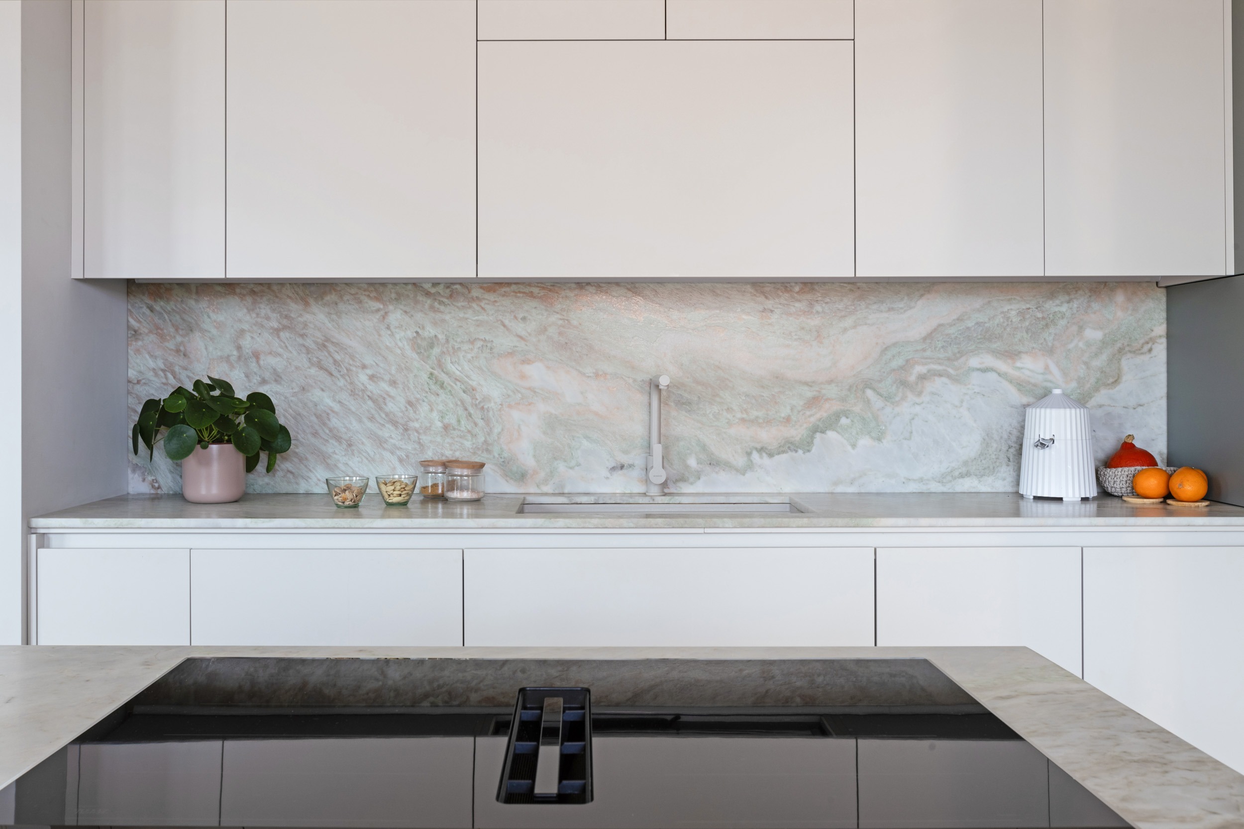L’alloggio finemente ristrutturato si distingue per l’atmosfera raffinata dominata da colori tenui e delicati, in cui spiccano le colonne della cucina di un elegante verde ottanio chiaro. Queste con le loro modanature, reinterpretano in chiave moderna le boiserie d’epoca, smorzando la solidità della struttura grazie alle vetrine in vetro, che ne alleggeriscono l’impatto visivo. Il marmo Jakarta Pink, con le sue venature intense e tonalità delicate, arricchisce l’ambiente, conferendo un tocco di preziosità. Il living in stretta connessione con la cucina accoglie un divano Saba perfettamente coordinato con i toni della cucina. La camera da letto Padronale è un piccolo gioiello, con due aperture specchiate e vetrate che si intersecano con il bagno, dove una vasca freestanding rappresenta il fulcro di uno spazio pensato per il relax e il benessere.