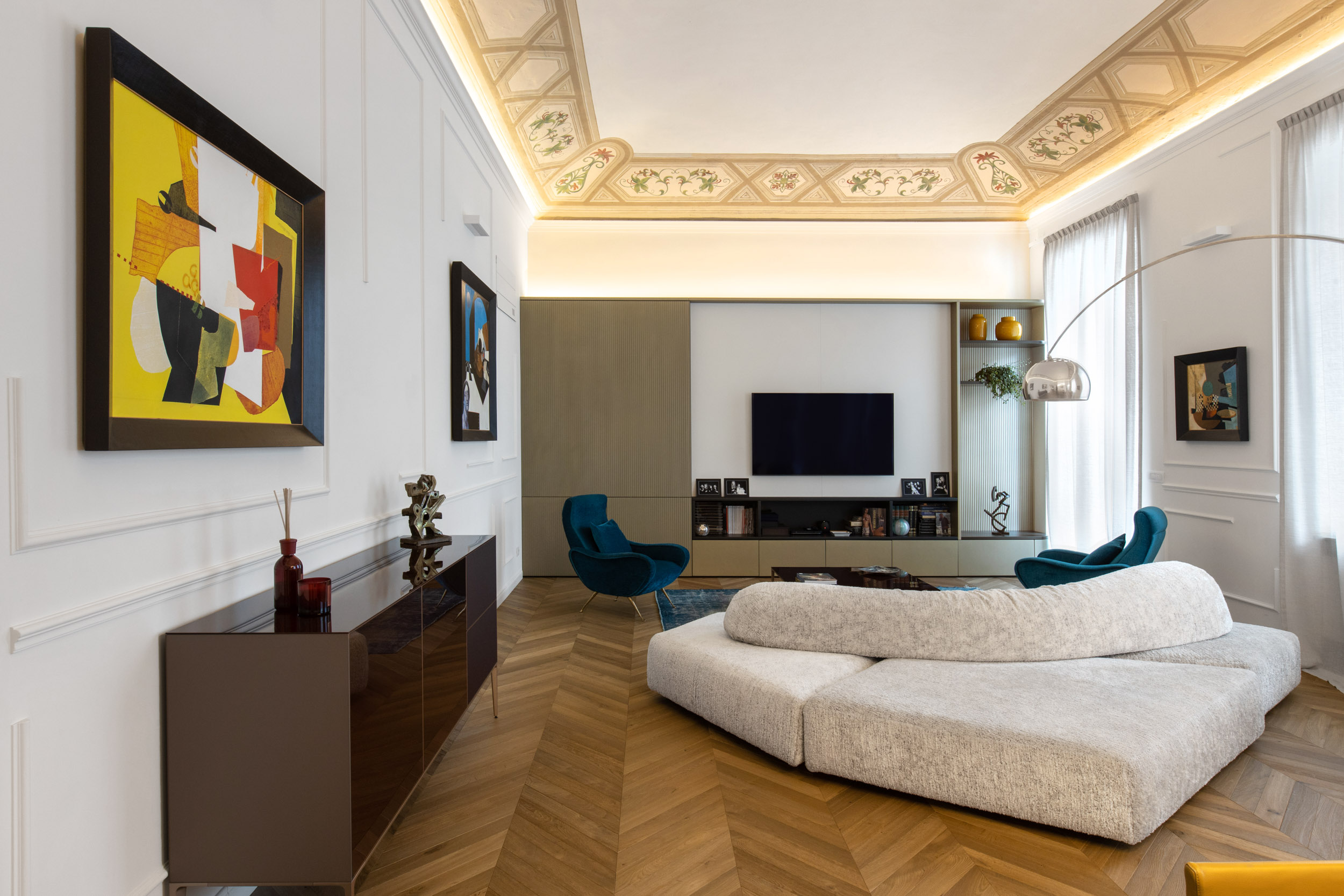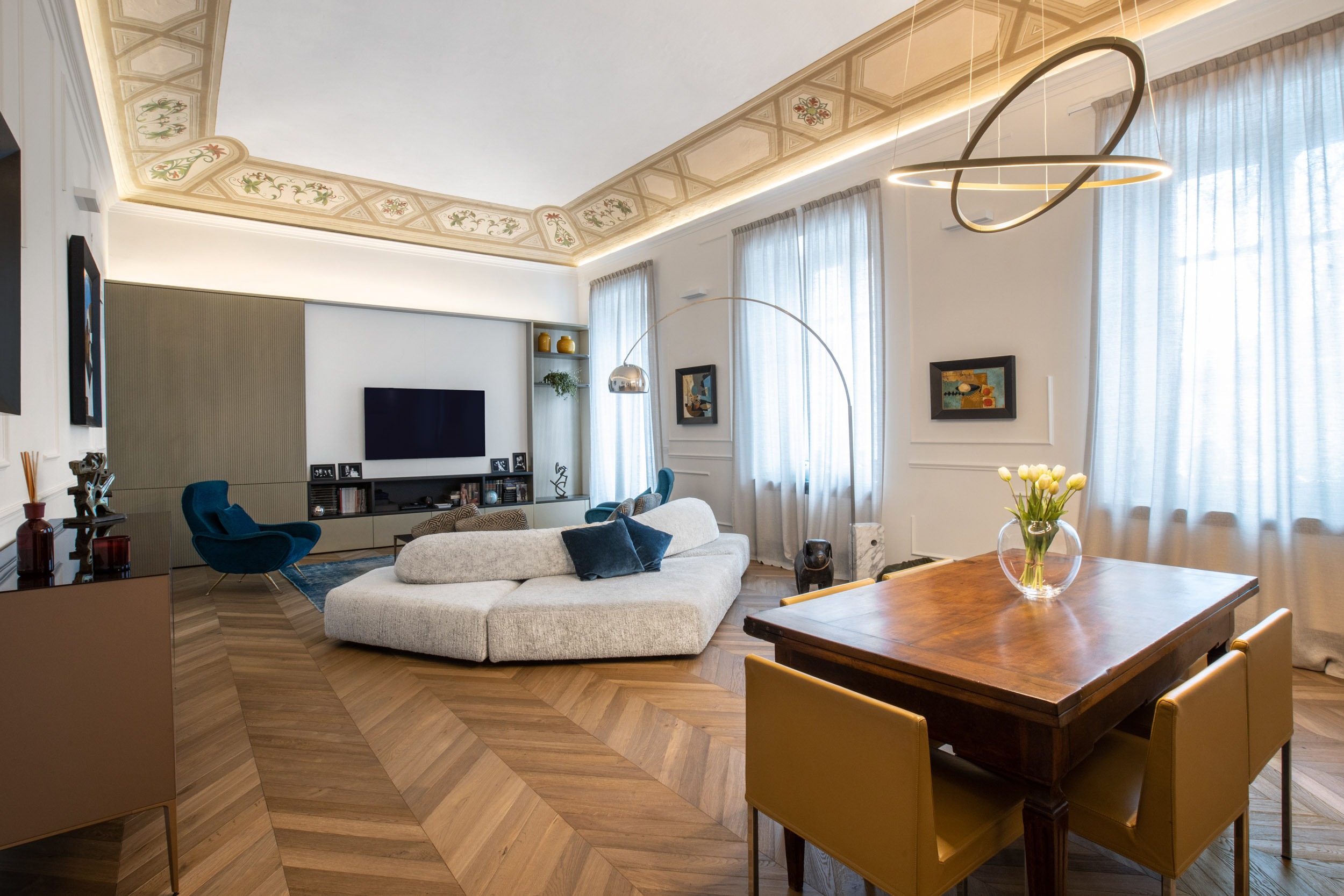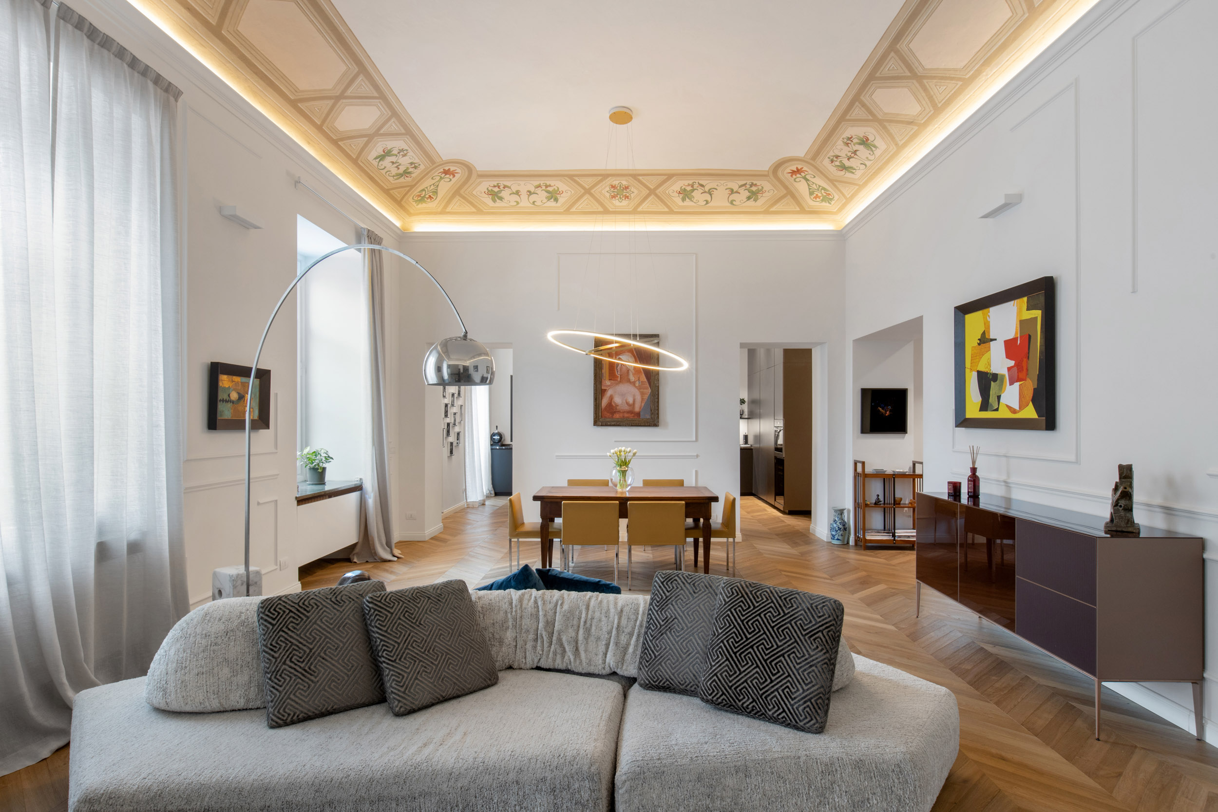 Nel cuore pulsante di Torino, un appartamento d’epoca torna a vivere grazie a un attento intervento di recupero e reinterpretazione. Durante i lavori di ristrutturazione, sono emersi uno splendido soffitto a volta e affrschi, da anni celati da un anonimo controsoffitto. Questi elementi originali, riportati alla luce con grande cura, sono oggi protagonisti assoluti dello spazio, testimoni della storia e dell’identità dell’edificio.