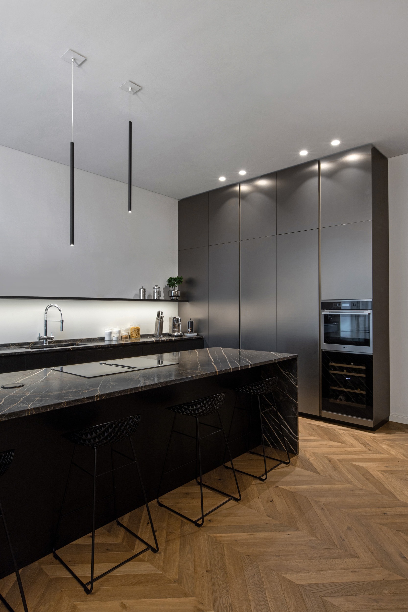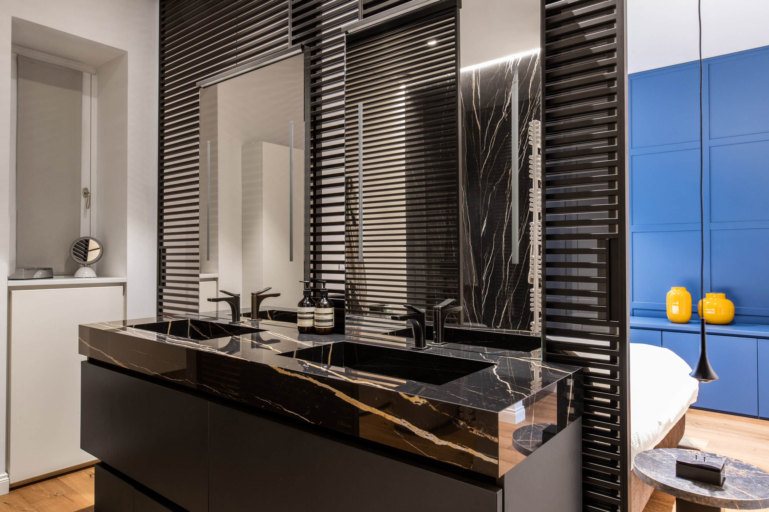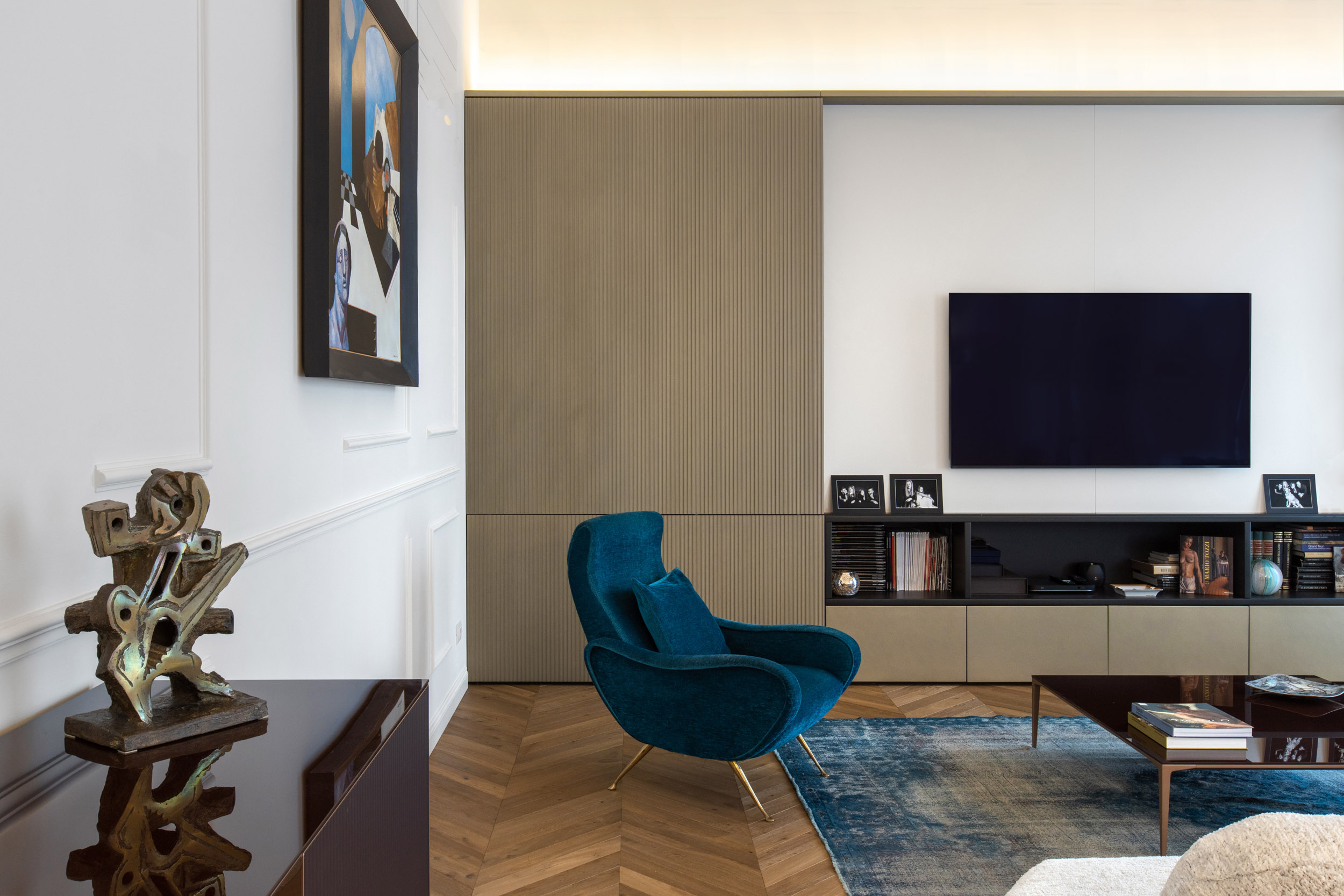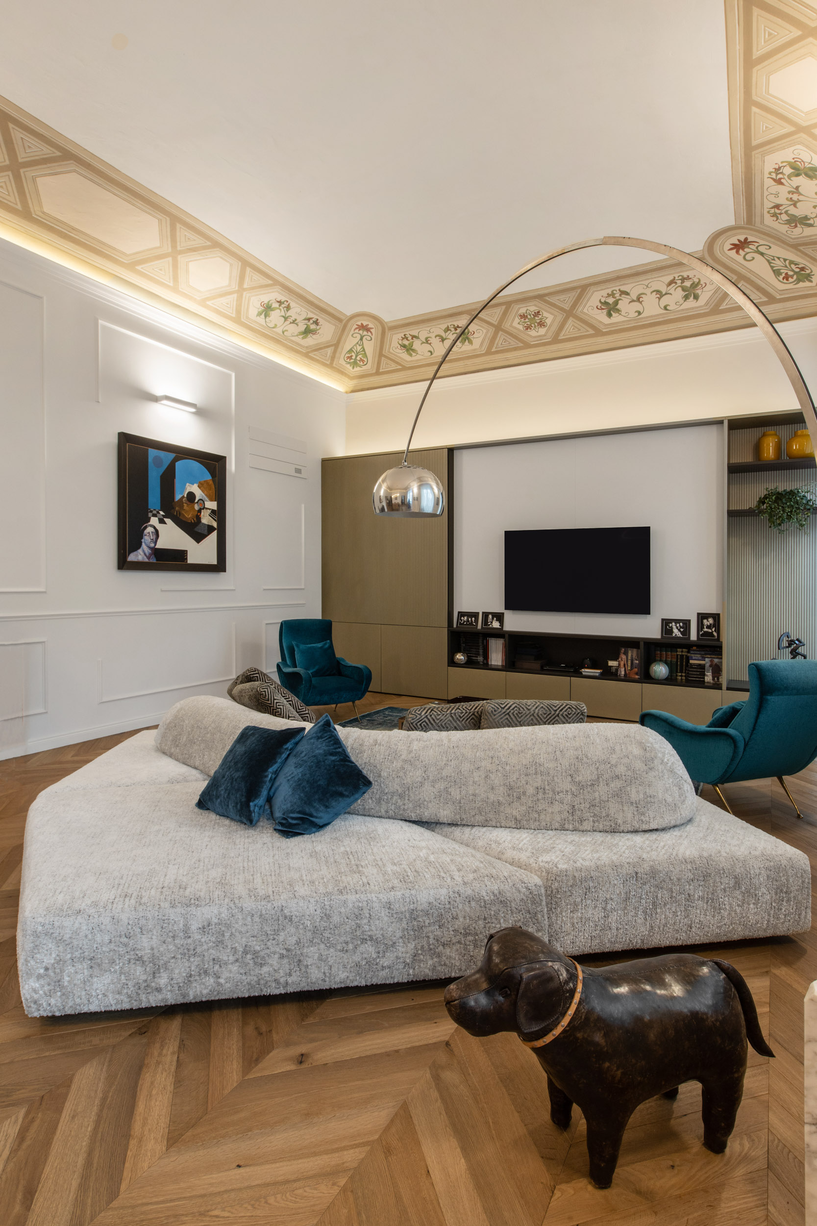 Nel cuore pulsante di Torino, un appartamento d’epoca torna a vivere grazie a un attento intervento di recupero e reinterpretazione. Durante i lavori di ristrutturazione, sono emersi uno splendido soffitto a volta e affrschi, da anni celati da un anonimo controsoffitto. Questi elementi originali, riportati alla luce con grande cura, sono oggi protagonisti assoluti dello spazio, testimoni della storia e dell’identità dell’edificio.